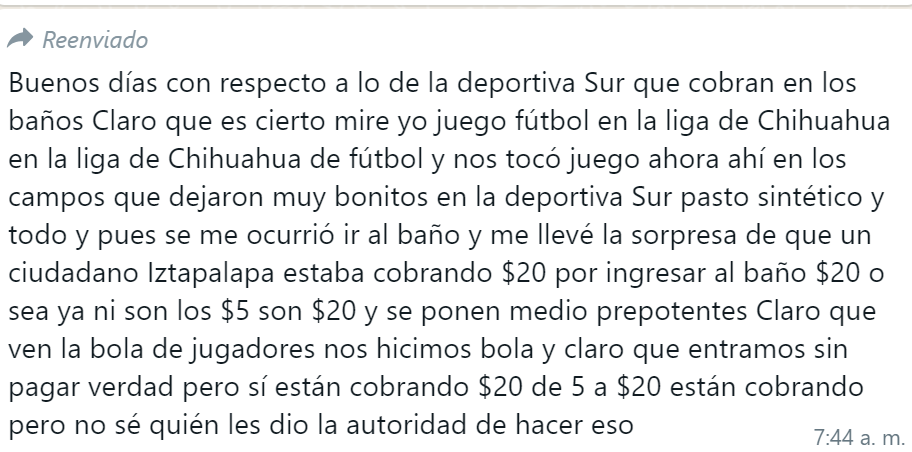 Chihuahua, Chih.- Lectores de enblancoynegro.com.mx reportaron un cobro ilegal de 20 pesos para el uso de los baños de la Deportiva Sur, señalando que las personas que realizan esta actividad ilícita ni siquiera son originarios del Estado de Chihuahua.