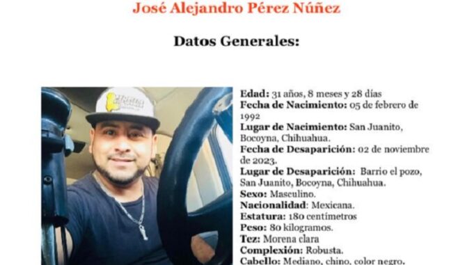 Bocoyna.- Autoridades y familiares de José Alejandro Pérez Núñez solicitan la colaboración de la ciudadanía para dar con su paradero. José originario de San Juanito cuenta con 31