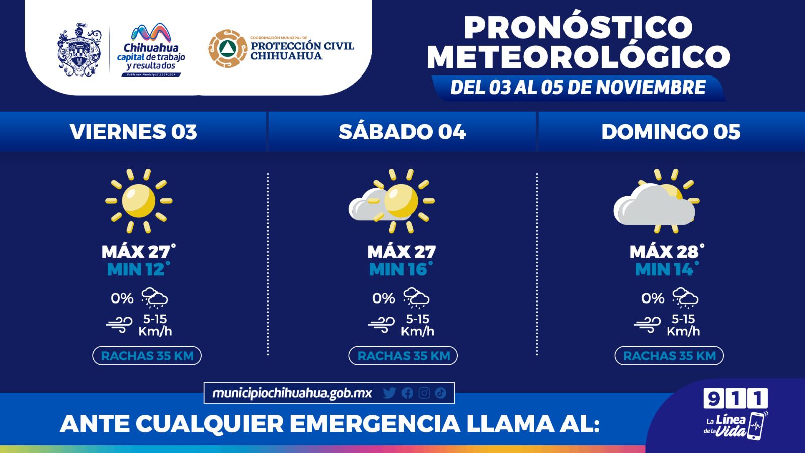 Chihuahua Chih.- La Coordinación Municipal de Protección Civil, informa que este fin de semana, del 3 al 5 de noviembre, se prevén temperaturas máximas de 28°C y la