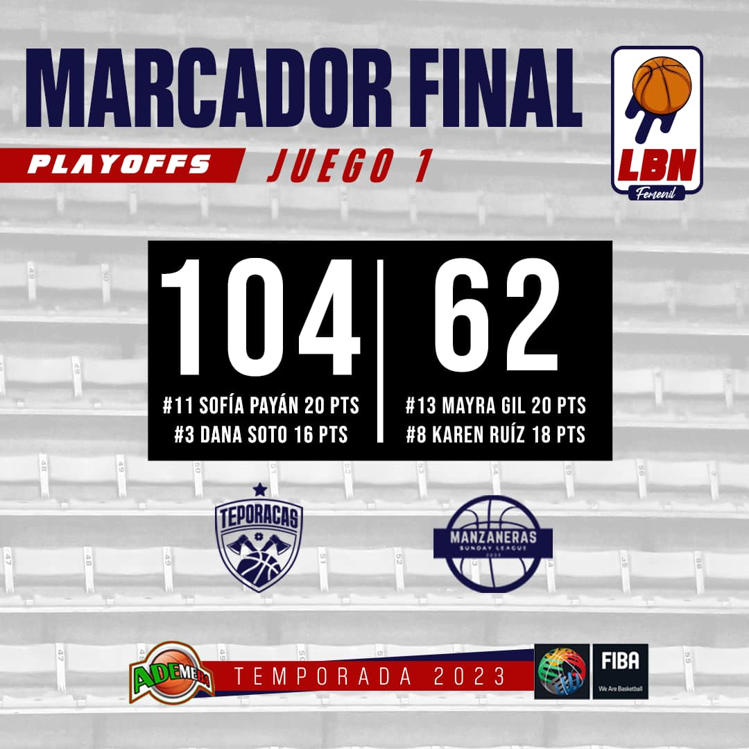 La chihuahuense Sofia Payan fue la mejor anotadora por parte de Teporacas consiguiendo 20 puntos mientras que Dani Soto aporto 16 unidades a la ofensiva. Por su parte, Mayra Gil fue la líder anotadora de Manzaneras con 20 puntos.