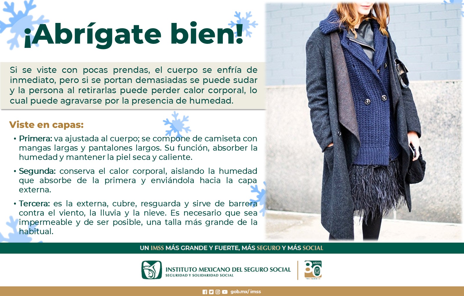 • Evitan la humedad y conservan el calor corporal En esta temporada de frío el Instituto Mexicano del Seguro Social (IMSS) en Chihuahua exhorta a la población extremar