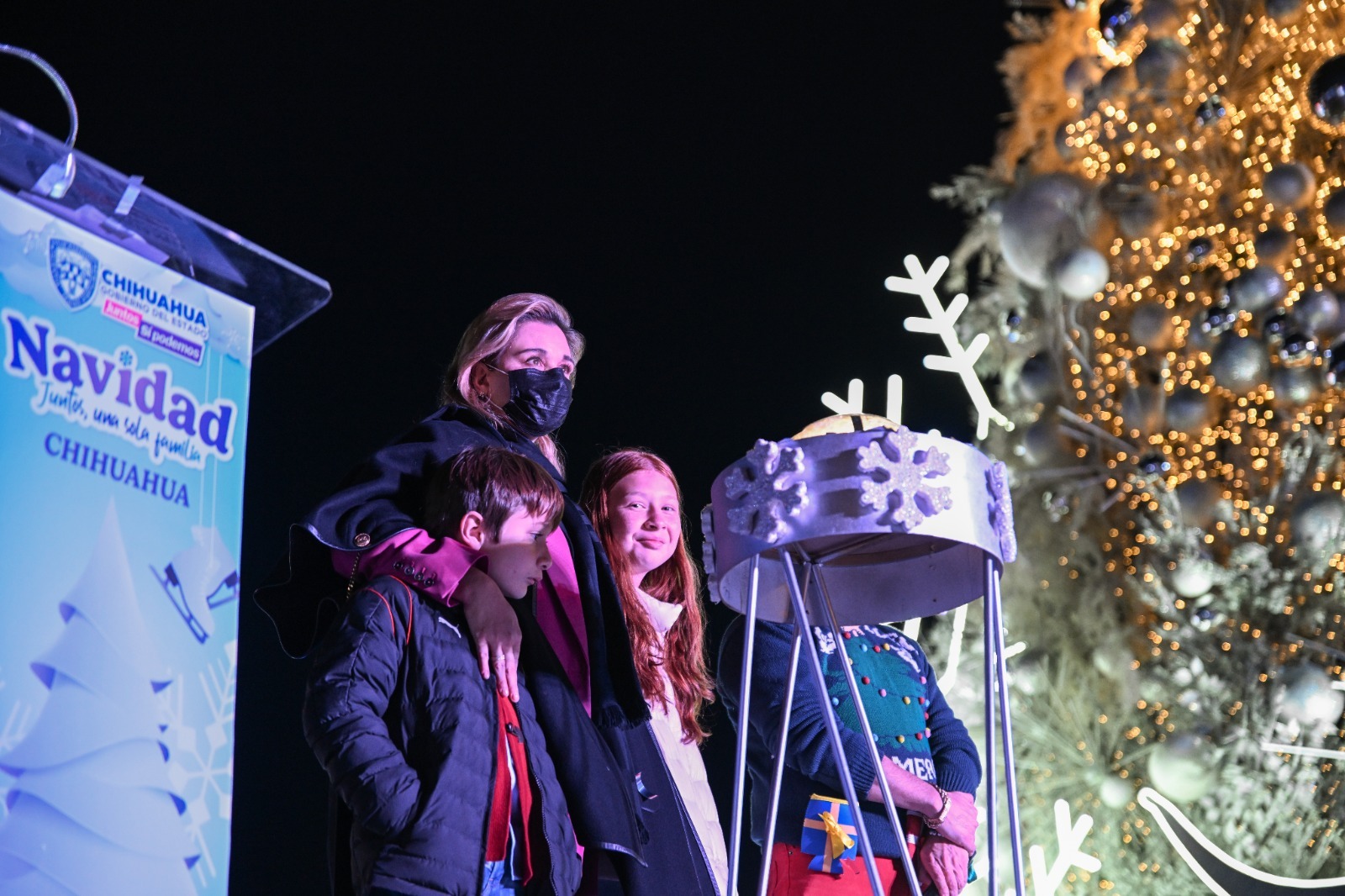 Al encabezar la ceremonia del tradicional encendido del Árbol de Navidad en la Plaza del Ángel, la gobernadora Maru Campos dijo a los chihuahuenses: “Encendamos una luz en