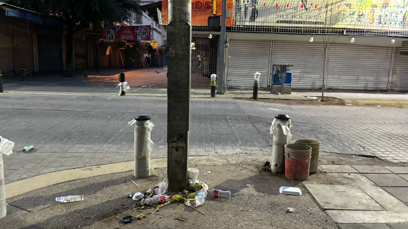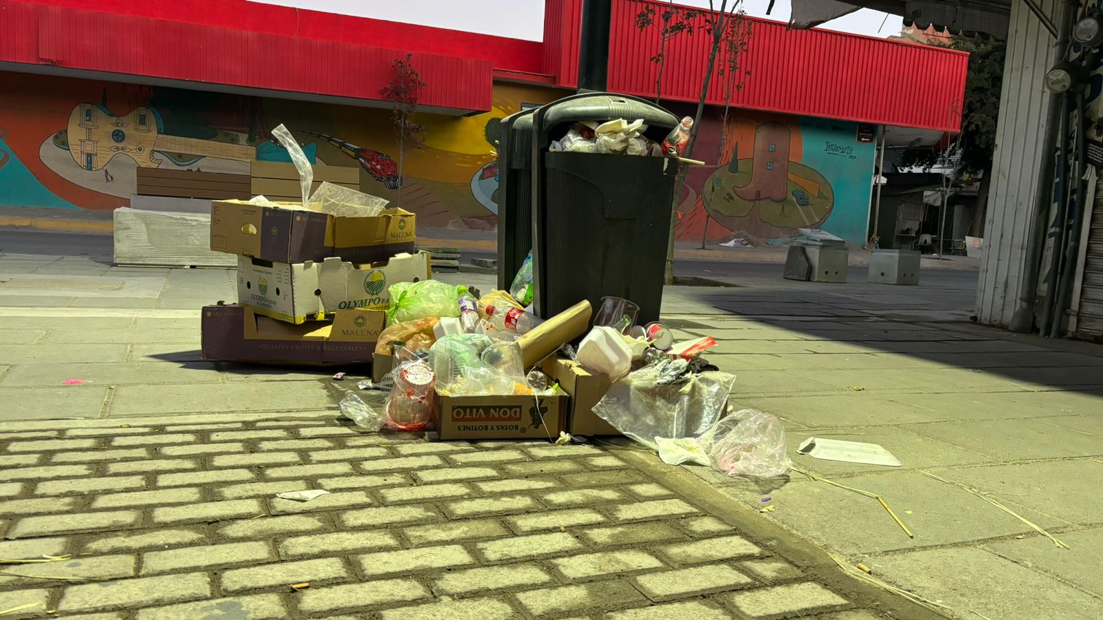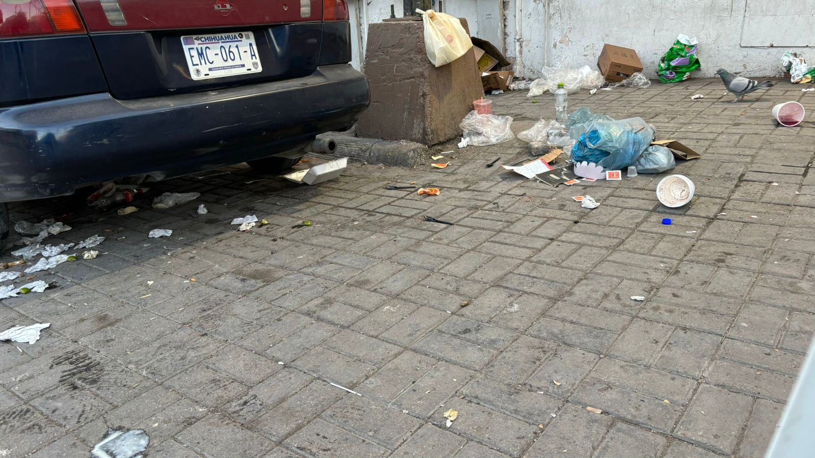 En el centro del municipio de Chihuahua en la calle cuarta y avenida Juárez se puede encontrar una gran cantidad de basura en el piso, ya que los depósitos de basura están que se desbordan.