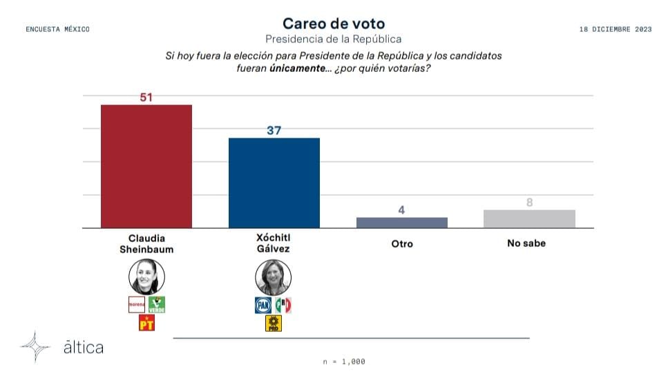 La casa encuestadora Áltica, presentó los resultados de una encuesta nacional de preferencias electorales, que colocan a la candidata de MORENA, Claudia Sheinbaum con una ventaja sobre Xóchitl
