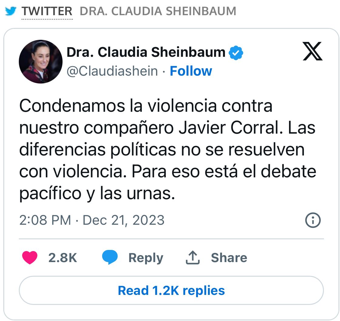 “Condenamos la violencia contra nuestro compañero Javier Corral. Las diferencias políticas no se resuelven con violencia. Para eso está el debate pacífico y las urnas”, expresó la precandidata en la red social “X” (anteriormente Twitter).