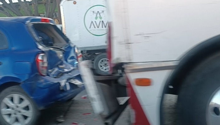 Un aparatoso choque dejó daños materiales en calles de la colonia San Jorge, provocado por el conductor de un camión urbano. El percance involucró un auto March de