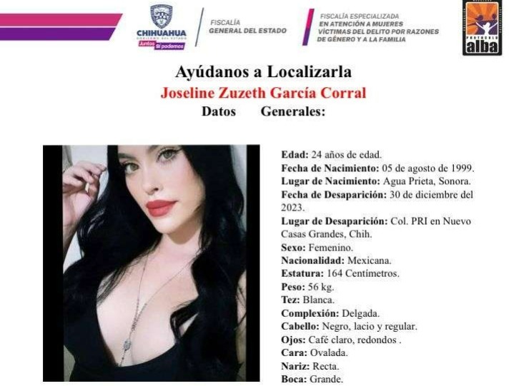 Una mujer originaria de Sonora, desapareció en Nuevo Casas Grandes, por lo que la Fiscalía activó el Protocolo Amber. Se trata de Joseline Zuzeth García Corral, de 24