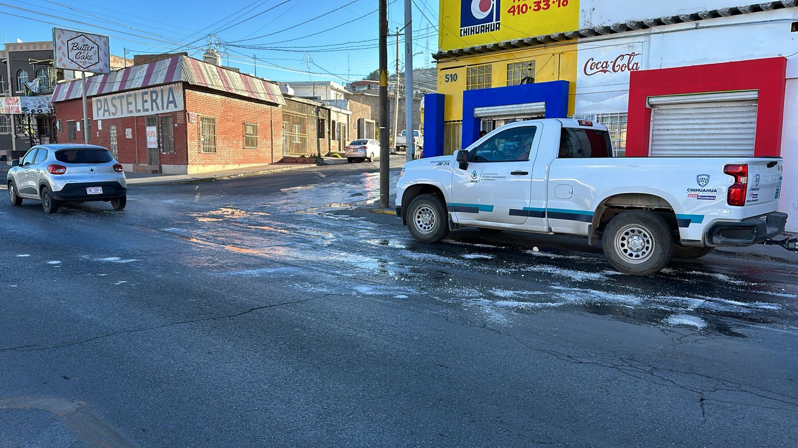 Chihuahua, Chih. – Una fuga de agua en la intersección de la Avenida 20 de Noviembre y Séptima ha generado condiciones peligrosas debido a las bajas temperaturas, resultando