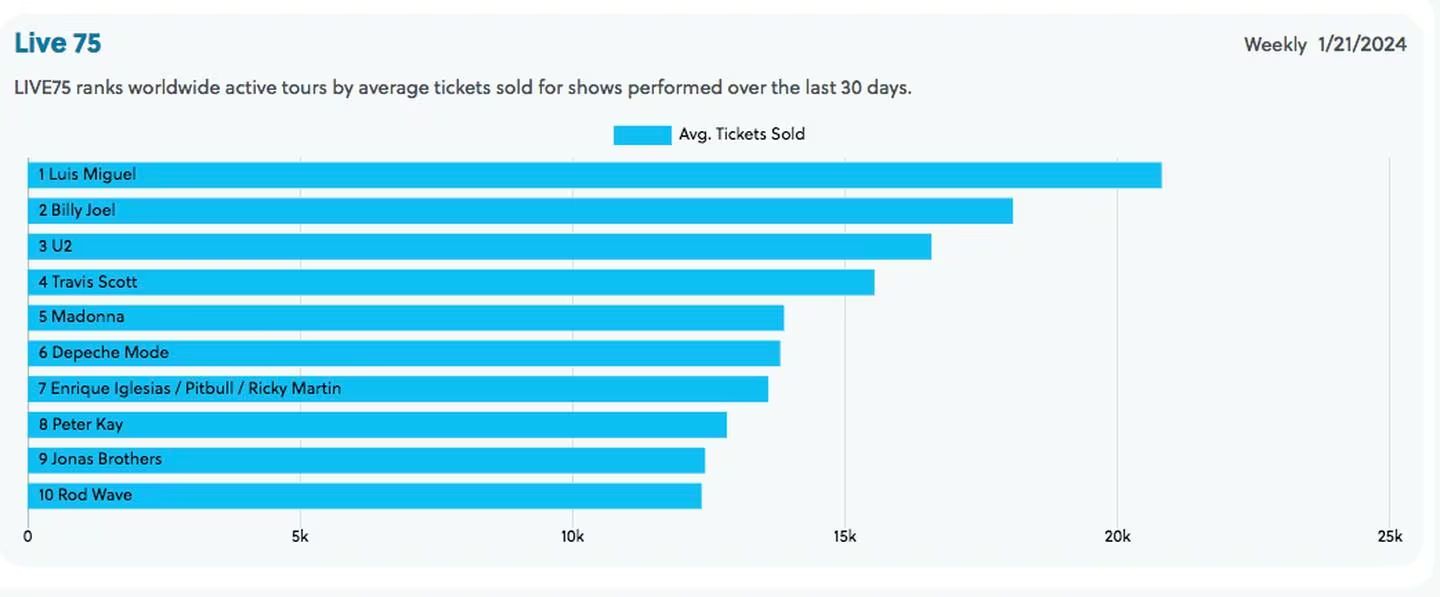 Luis Miguel ocupa el puesto número 1 en LIVE75 con un promedio de entradas vendidas de 20 mil 808 por show basado en las cifras de taquilla reportadas en su gira mundial actual.