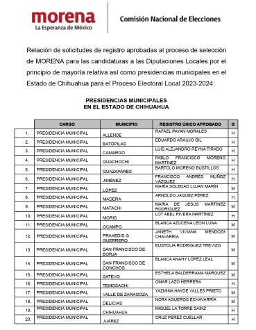Chihuahua, Chih.- El Partido Morena dio a conocer la lista de candidatos para las próximas elecciones del 2024, para las presidencias municipales y para las diputaciones ,locales.