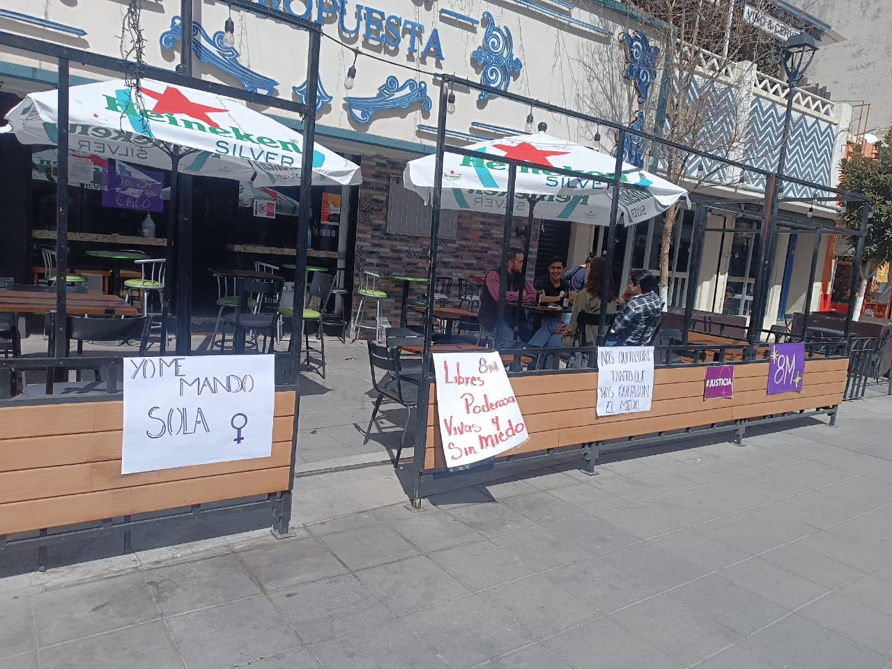 Chihuahua, Chih.- Distintos locales del primer cuadro de la ciudad colocaron distintos carteles a favor del movimiento del 8M por lo cual es posible verlos en los ventanales.