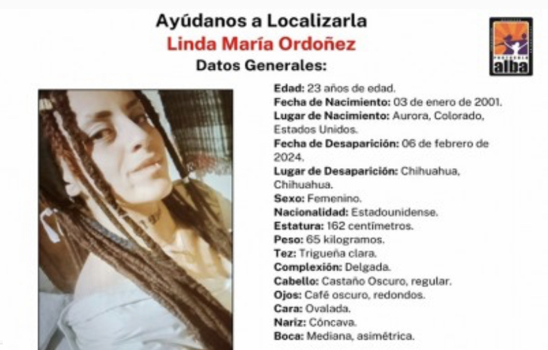 Chihuahua, Chih .- Solicitan apoyo para localizar a la joven de 23 años Linda Maria Ordóñez, originaria de Estados Unidos quien desapareció el pasado 6 de febrero en