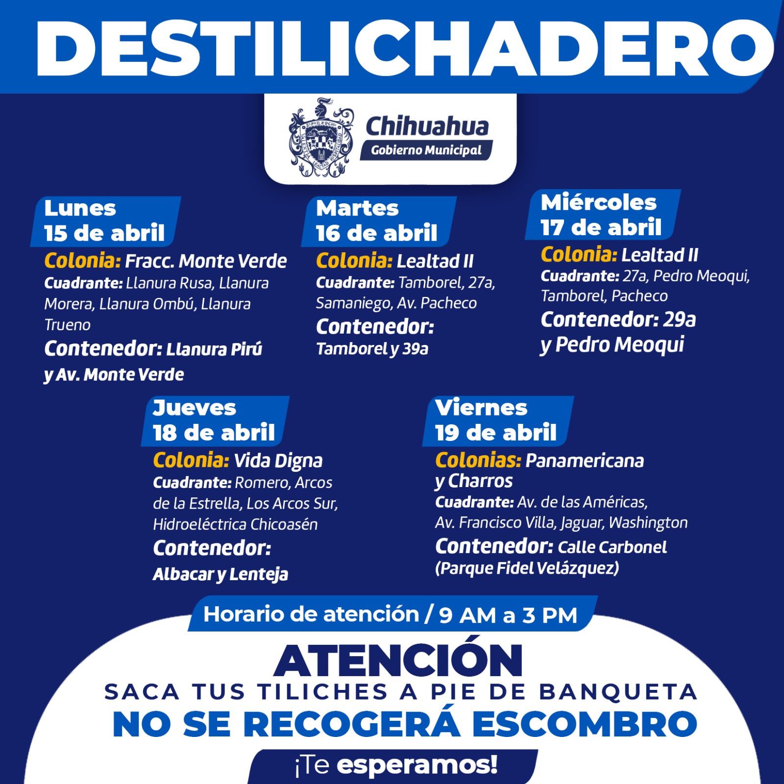 Chihuahua, Chih.- Para evitar acumulaciones de basura de grandes dimensiones en las viviendas, lo que podría generar plagas o problemáticas en la salud, el Gobierno Municipal, a través de la Dirección de Servicios Públicos Municipales, informa el calendario del programa Destilichadero, que se realizará del 15 al 19 de abril en cuatro colonias de la Capital.