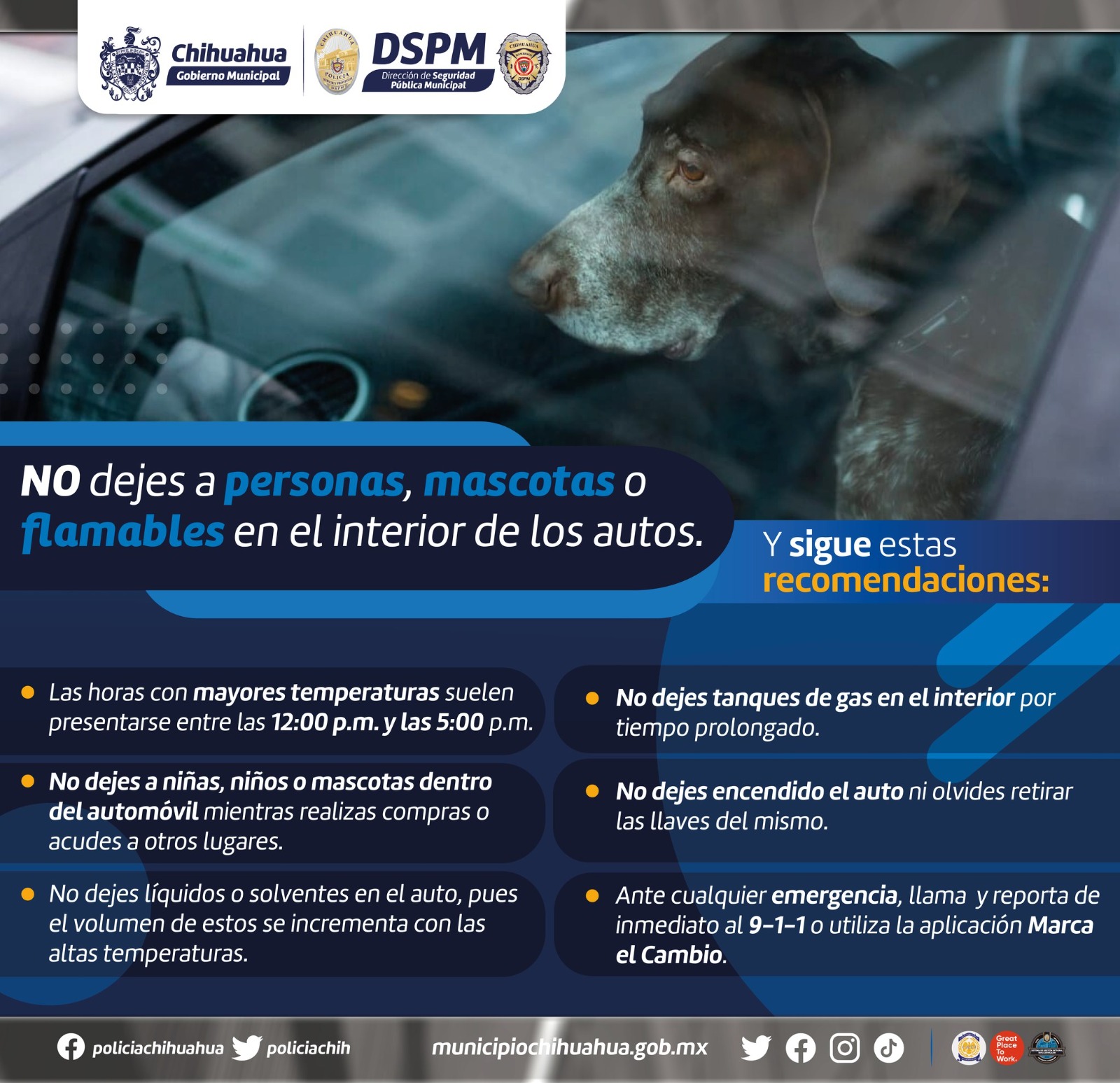 Chihuahua, Chih.- La Dirección de Seguridad Pública, exhorta a las y los chihuahuenses a no dejar niñas, niños, personas de la tercera edad ni mascotas dentro los automóviles, pues fácilmente pueden padecer deshidrataciones, golpes de calor u otras consecuencias de salud, debido a las altas temperaturas que ya iniciaron en la ciudad de Chihuahua por la temporada de calor.