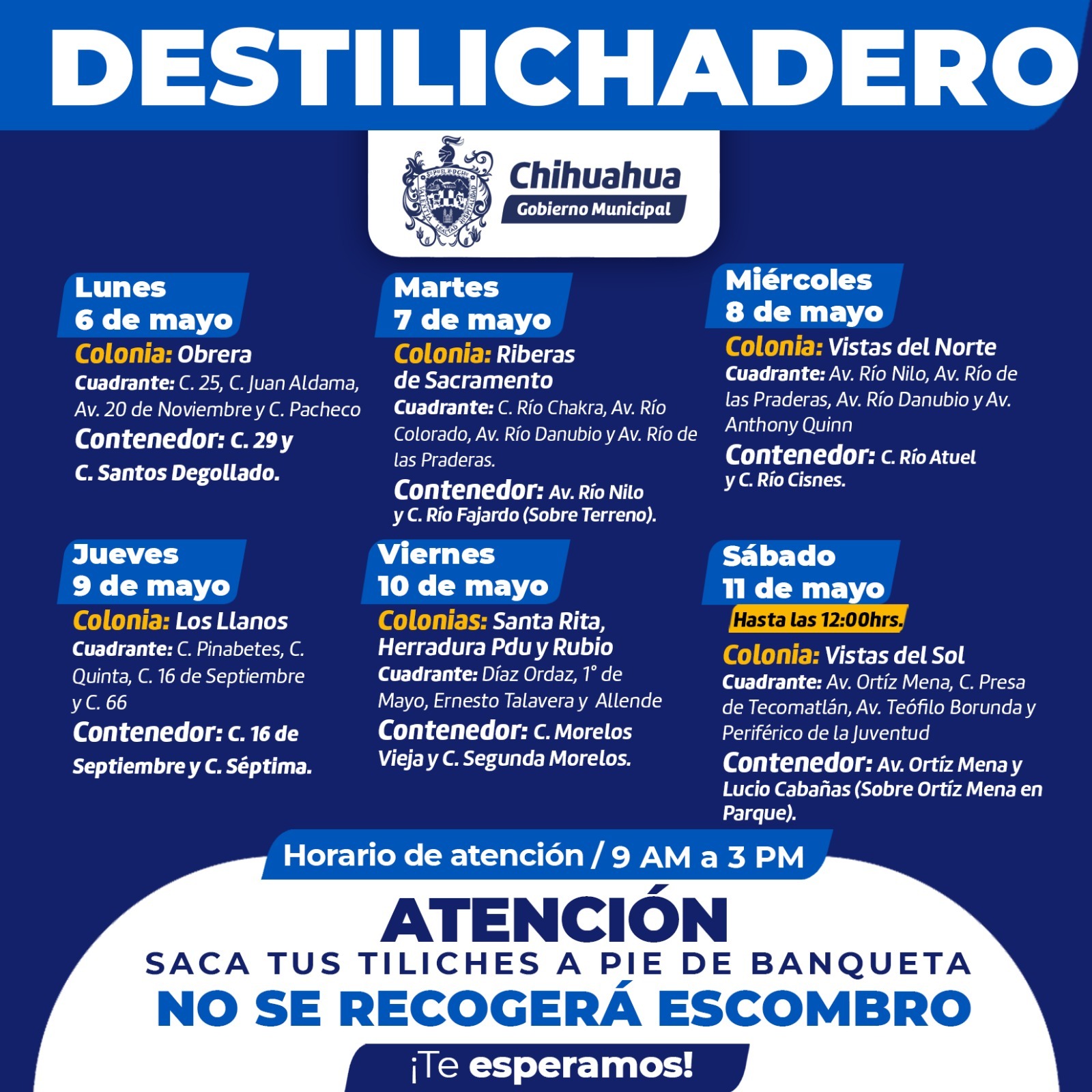 Chihuahua, Chih.- La Dirección de Servicios Públicos Municipales, informa el calendario del programa Destilichadero, que se realizará del 06 al 11 de mayo en ocho colonias de la Capital, para evitar acumulación de grandes dimensiones de basura en las viviendas que podría generar plagas o problemáticas en la salud.