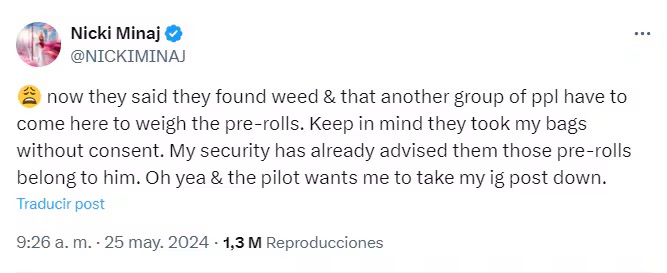 Posteriormente, Minaj publicó en X: “Ahora dicen que han encontrado hierba y que otro grupo de personas tiene que venir aquí para pesar los pre-rolls (cigarrillos de marihuana prearmados). Tengan en cuenta que tomaron mis bolsas sin consentimiento. Mi seguridad ya les ha avisado que esos porros le pertenecen. Ah, y el piloto quiere que quite mi publicación de Instagram”.