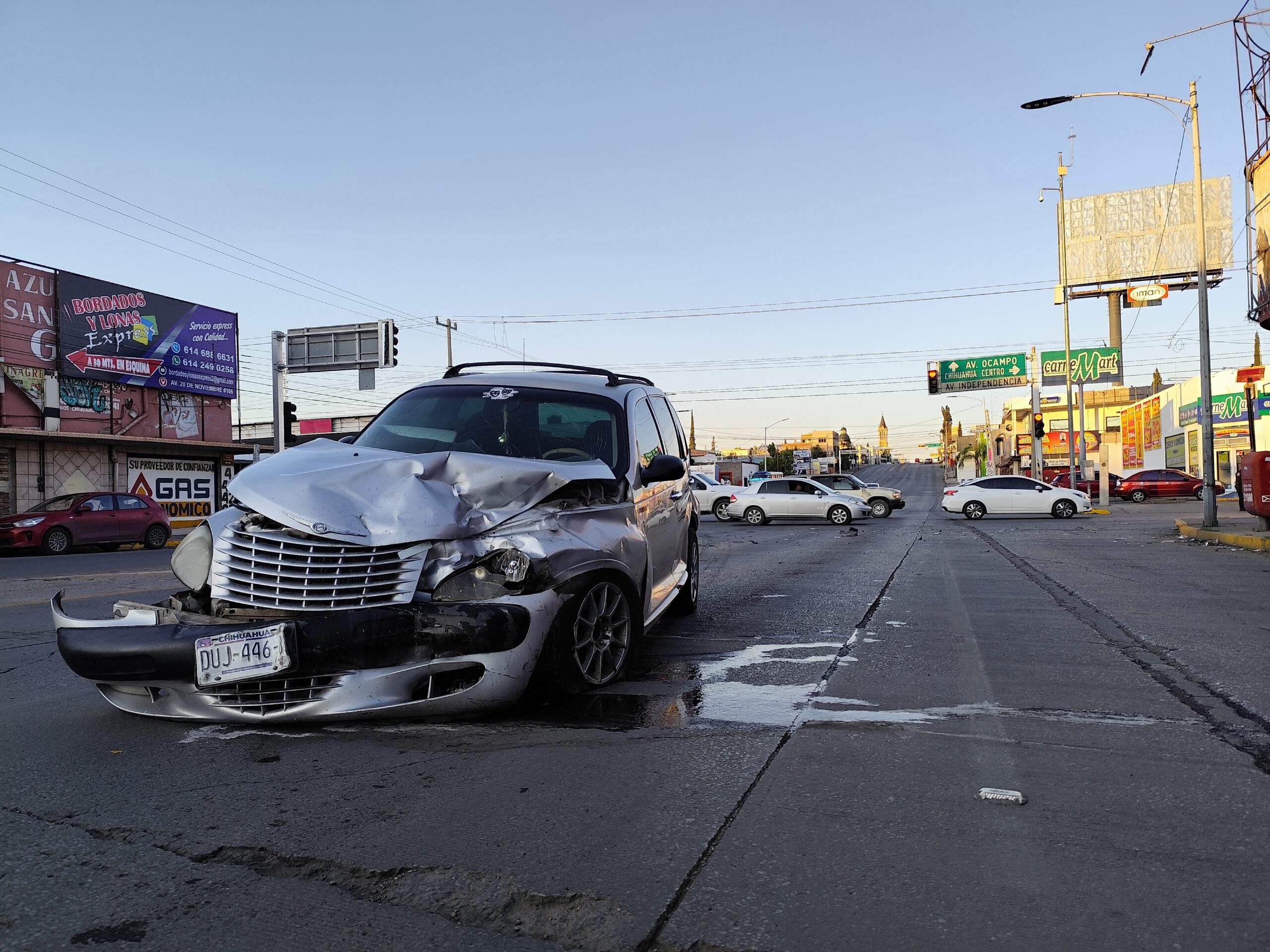 Chihuahua, Chih.- Un accidente vehicular ocurrió en la intersección de la avenida Independencia y avenida 20 de noviembre, en el centro de la ciudad de Chihuahua, dejando cuantiosos
