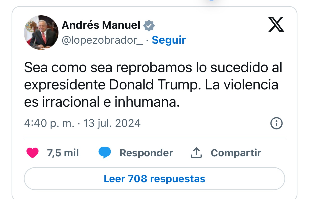 “Sea como sea reprobamos lo sucedido al expresidente Donald Trump. La violencia es irracional e inhumana”, escribió el mandatario en la plataforma X.