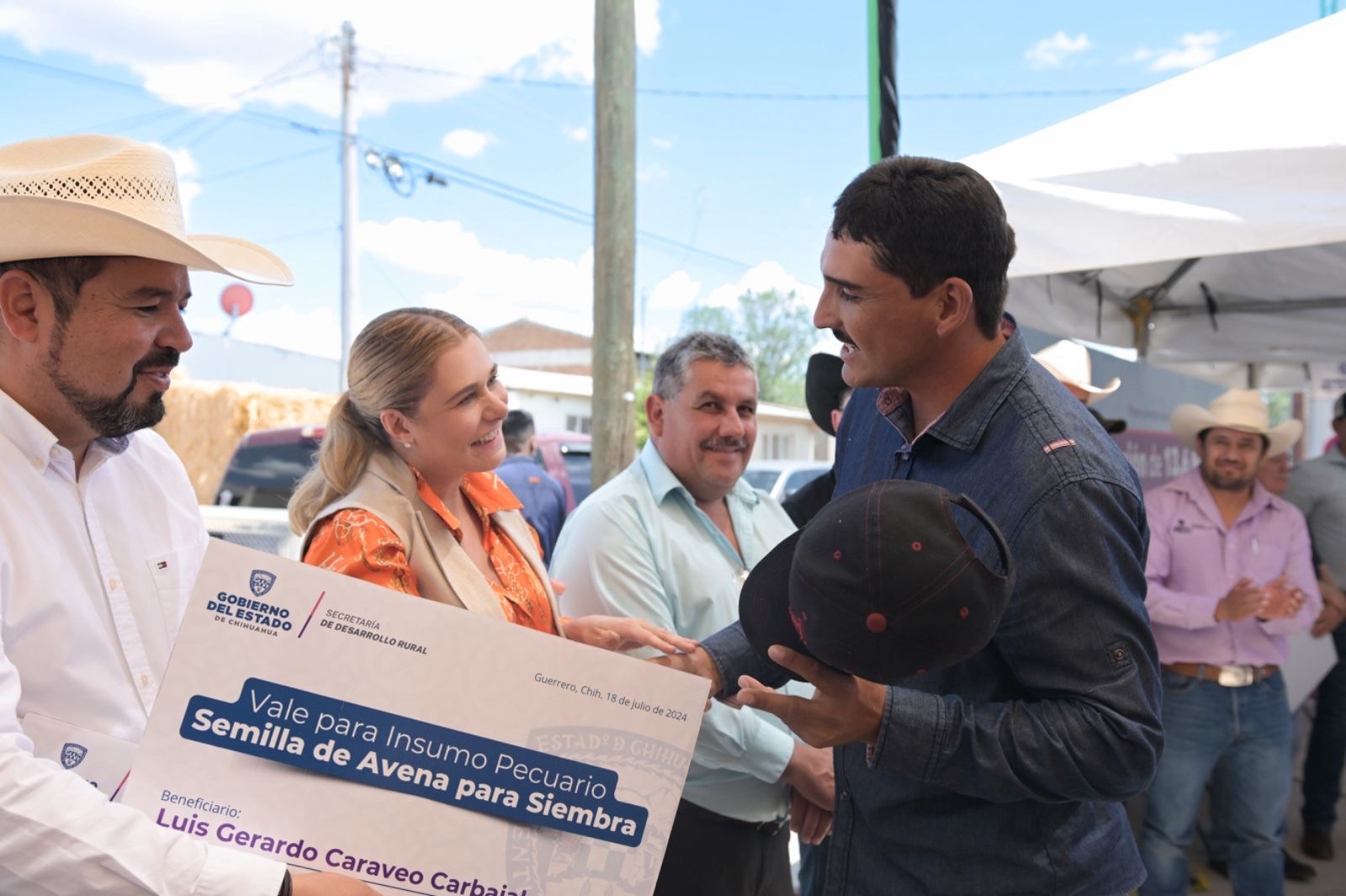 En el stand de la Secretaría de Desarrollo Rural, acompañó la distribución simbólica de insumos y créditos emergentes por 250 mil pesos, que en conjunto con el Fideicomiso Estatal para el Fomento de las Actividades Productivas del Estado, se otorgan con un 5 por ciento de interés anual para financiar a los trabajadores agrícolas y pecuarios.