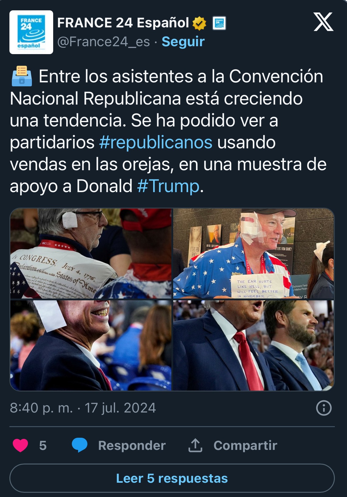 Entre las gorras rojas con las letras TRUMP y las camisetas de MAGA (‘Make America Great Again’, el lema trumpista) hay un look que se ha colado estos días en el foro donde se celebra la Convención Nacional Republicana: la oreja vendada, en solidaridad con el expresidente Donald Trump, superviviente a un intento de asesinato el sábado 13 de julio.