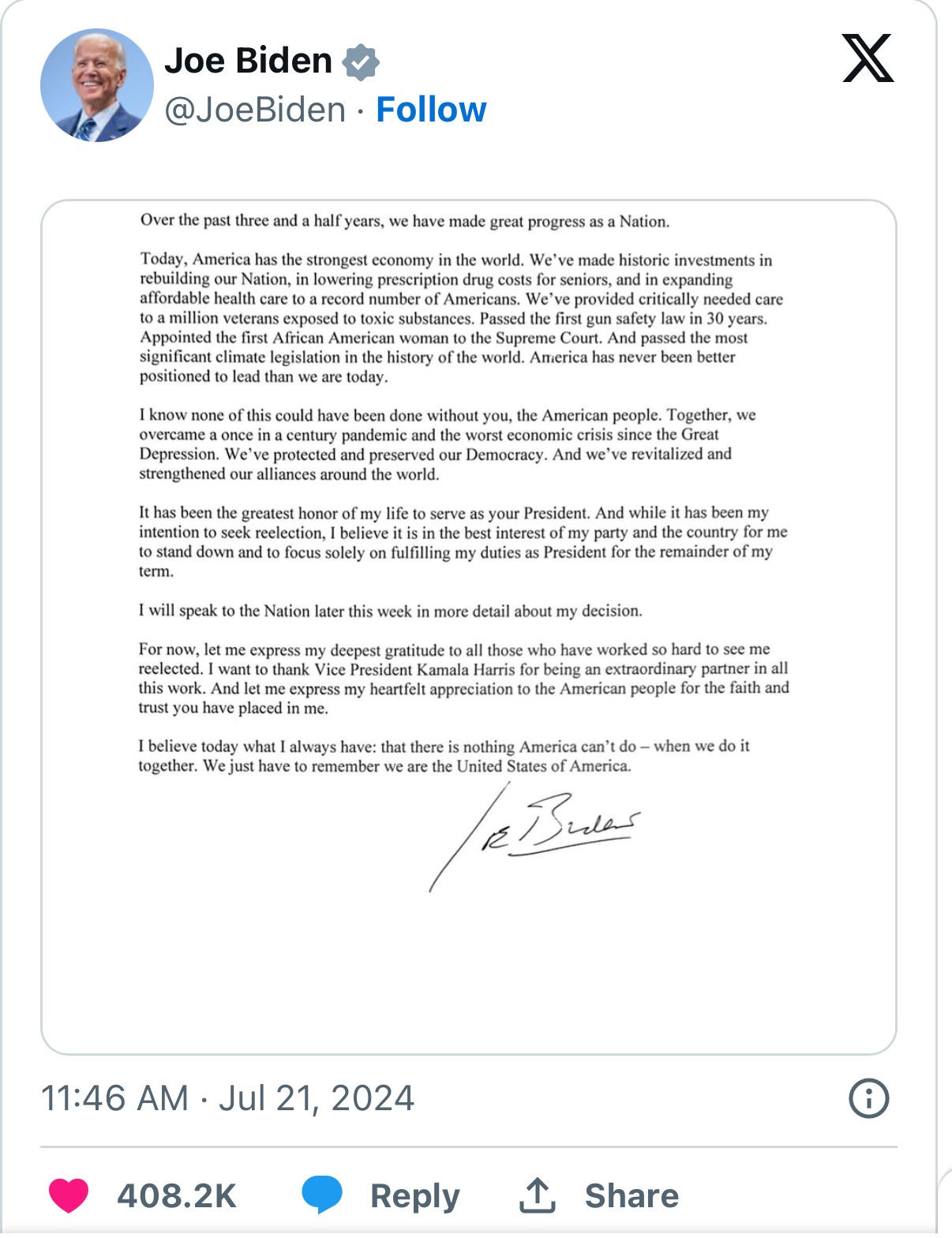 En una carta, el presidente de EU decidió abandonar la carrera a la reelección, por el interés de su partido y del país, informó a través de una carta.