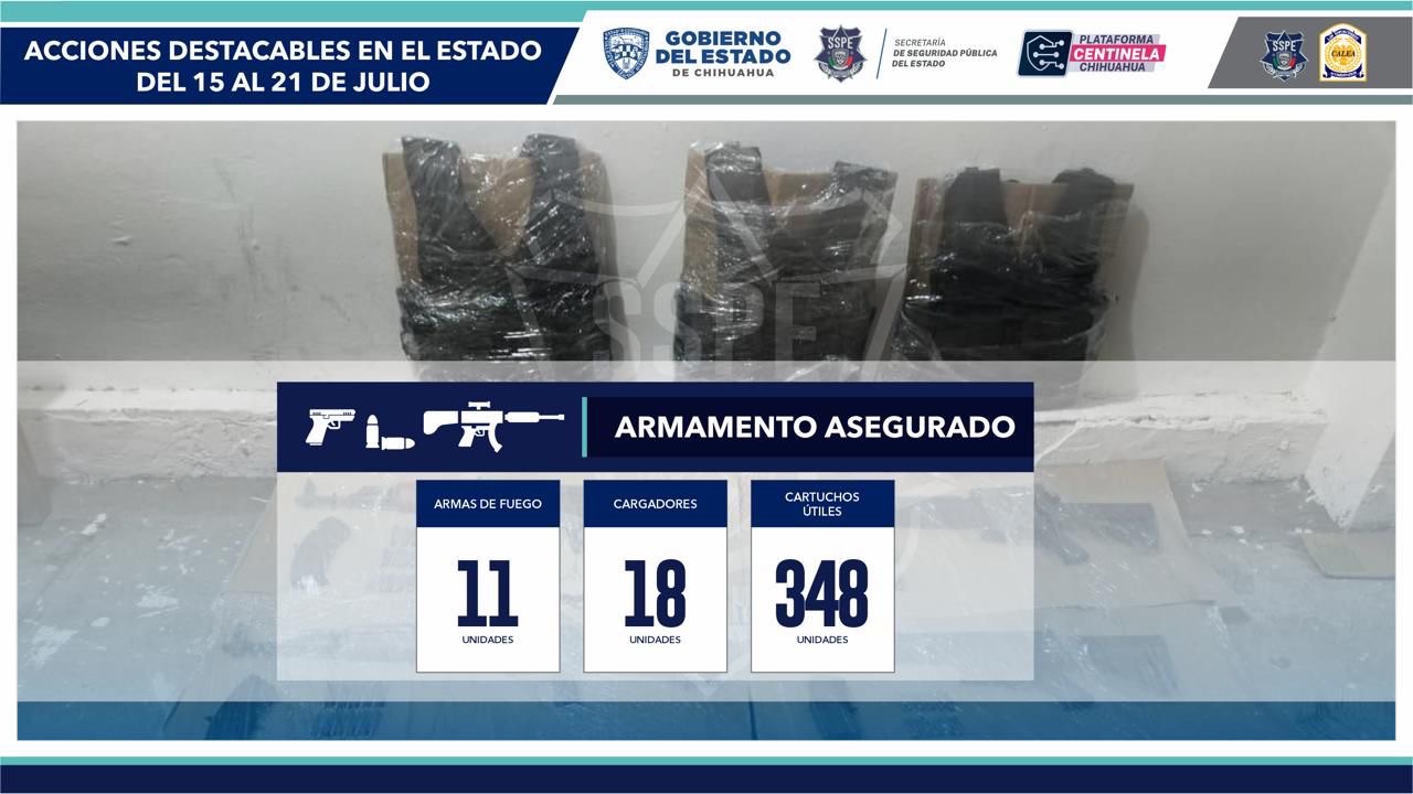 También se registró el aseguramiento de 11 armas de fuego, 18 cargadores, así como 348 cartuchos útiles.