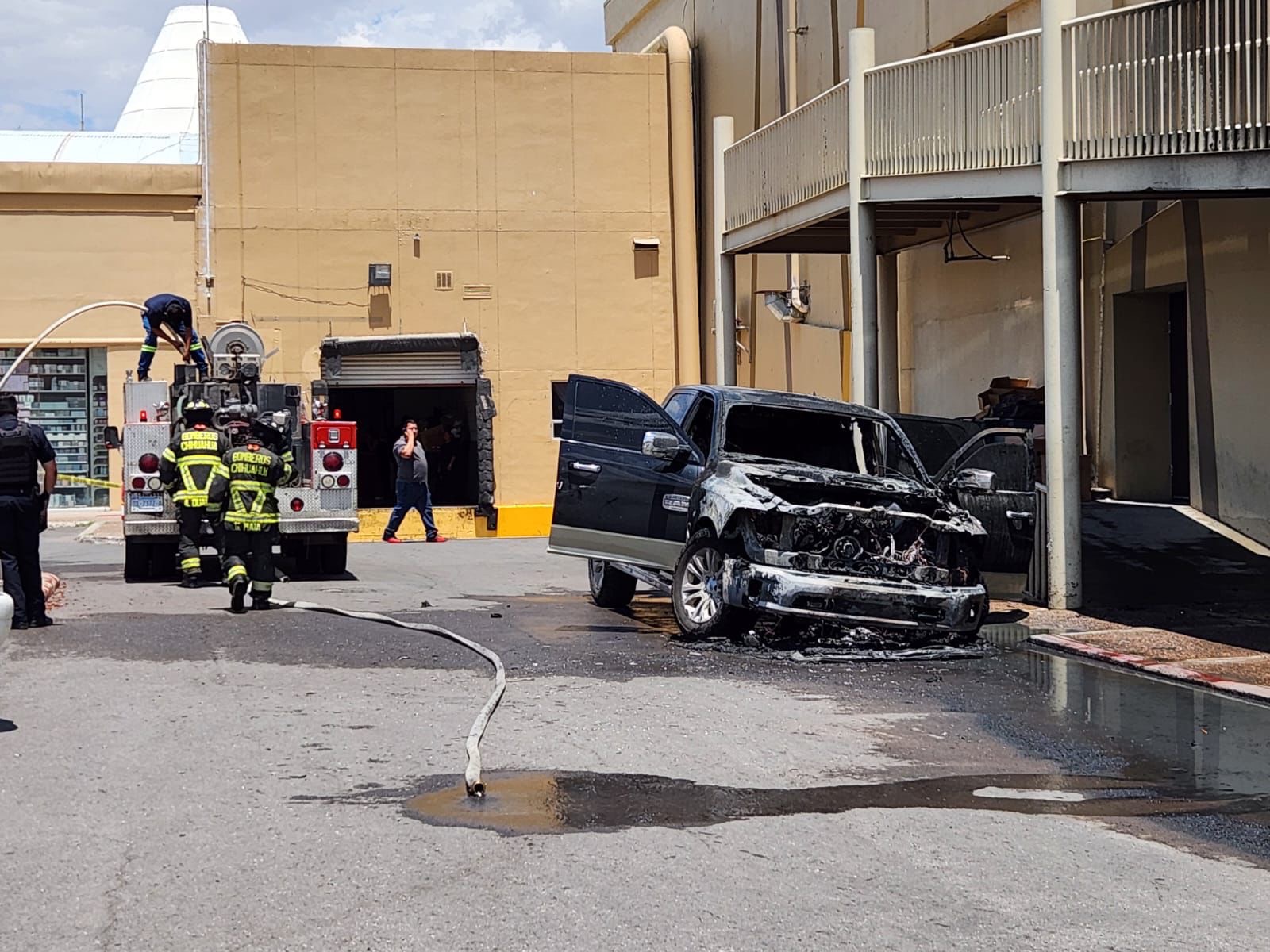 Chihuahua, Chih.- Totalmente incendiada quedó una pickup la tarde de hoy lunes en un centro comercial de la ciudad. Se trata de una Dodge Ram de color negro,
