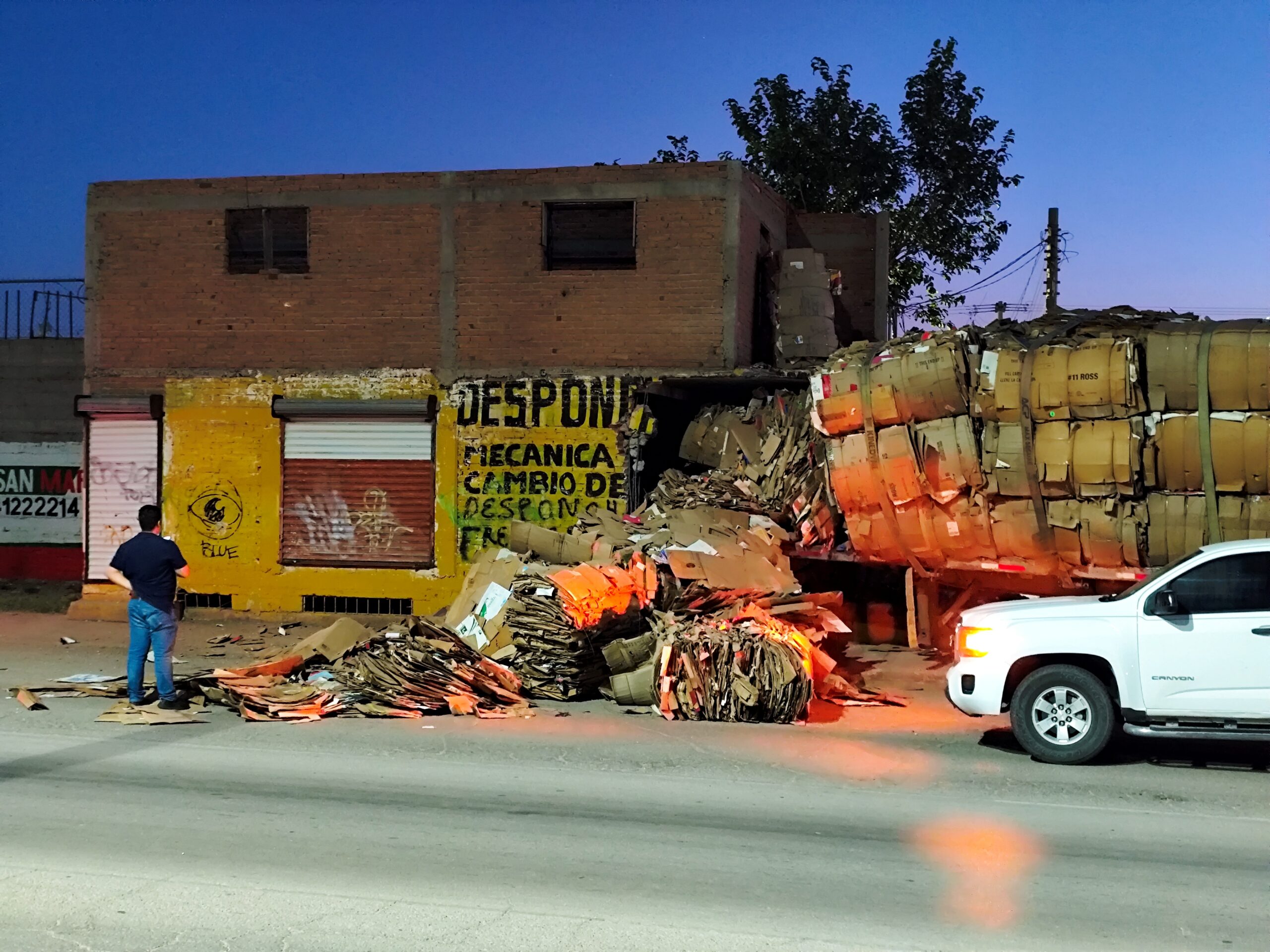 Chihuahua, Chih.- Un tráiler cargado con cartón impactó un negocio en la calle Ángel Posada y Periférico, R. Almada de colonia Villa Juárez. El conductor declaró que la