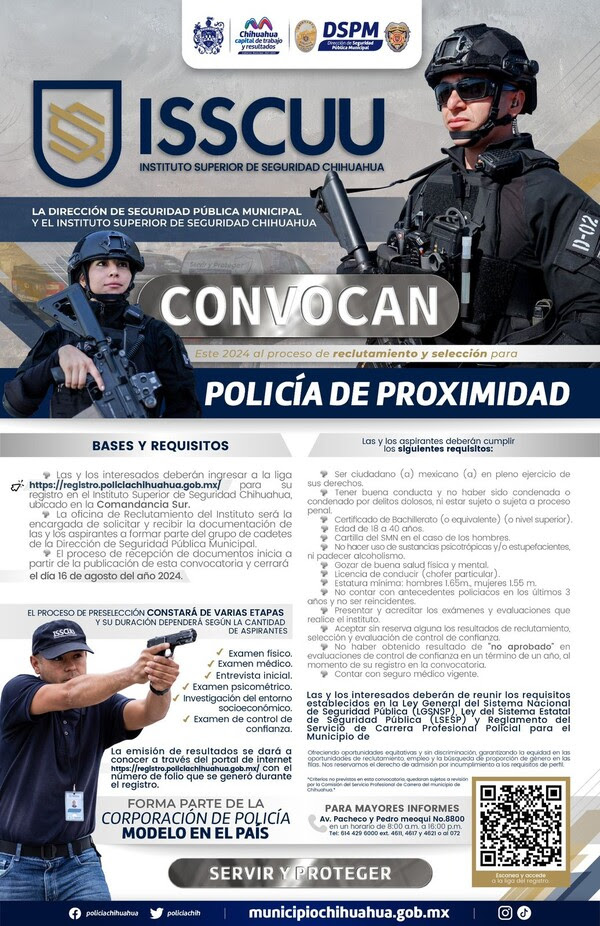 Chihuahua, Chih. A 13 de agosto de 2024.- La convocatoria para ingresar a las filas de la Policía Municipal de Chihuahua se encuentra a punto de cerrar, a casi dos meses de haber sido lanzada por la Dirección de Seguridad Pública Municipal, a través del Instituto Superior de Seguridad Chihuahua, ISSCUU.
