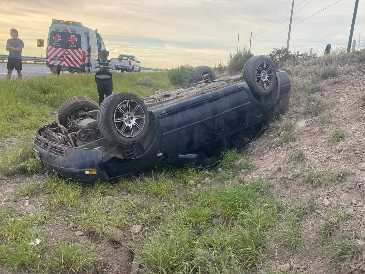 Chihuahua.- Tres personas resultaron con lesiones leves y se registraron daños materiales considerables tras una volcadura ocurrida la mañana de este viernes en la carretera federal, a la