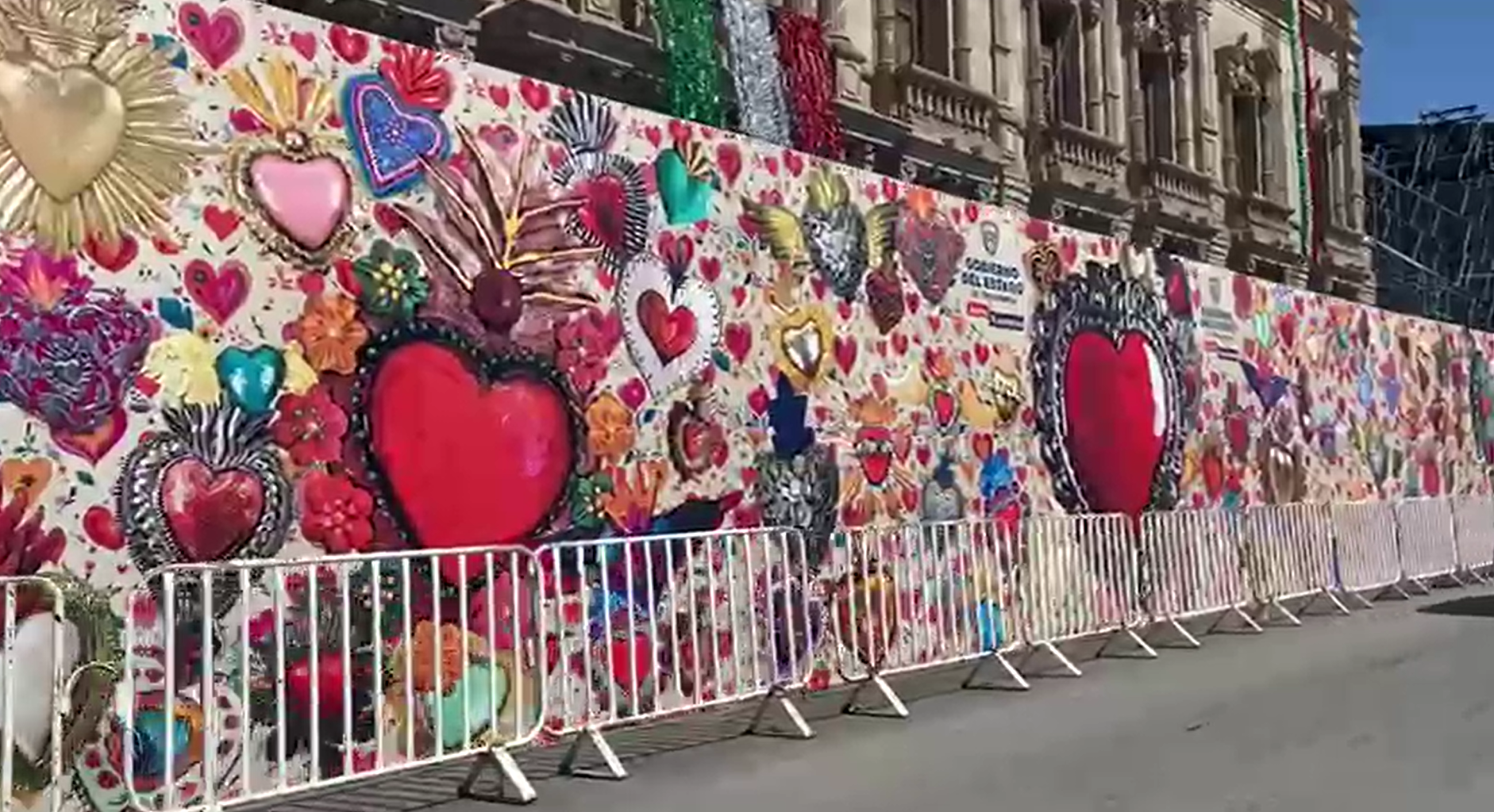 En la entrada del Palacio de Gobierno, sobre la calle Aldama, se han colocado unas bardas de madera adornadas con un mural de corazones de diversos tamaños y colores, como parte de los arreglos para la celebración.
