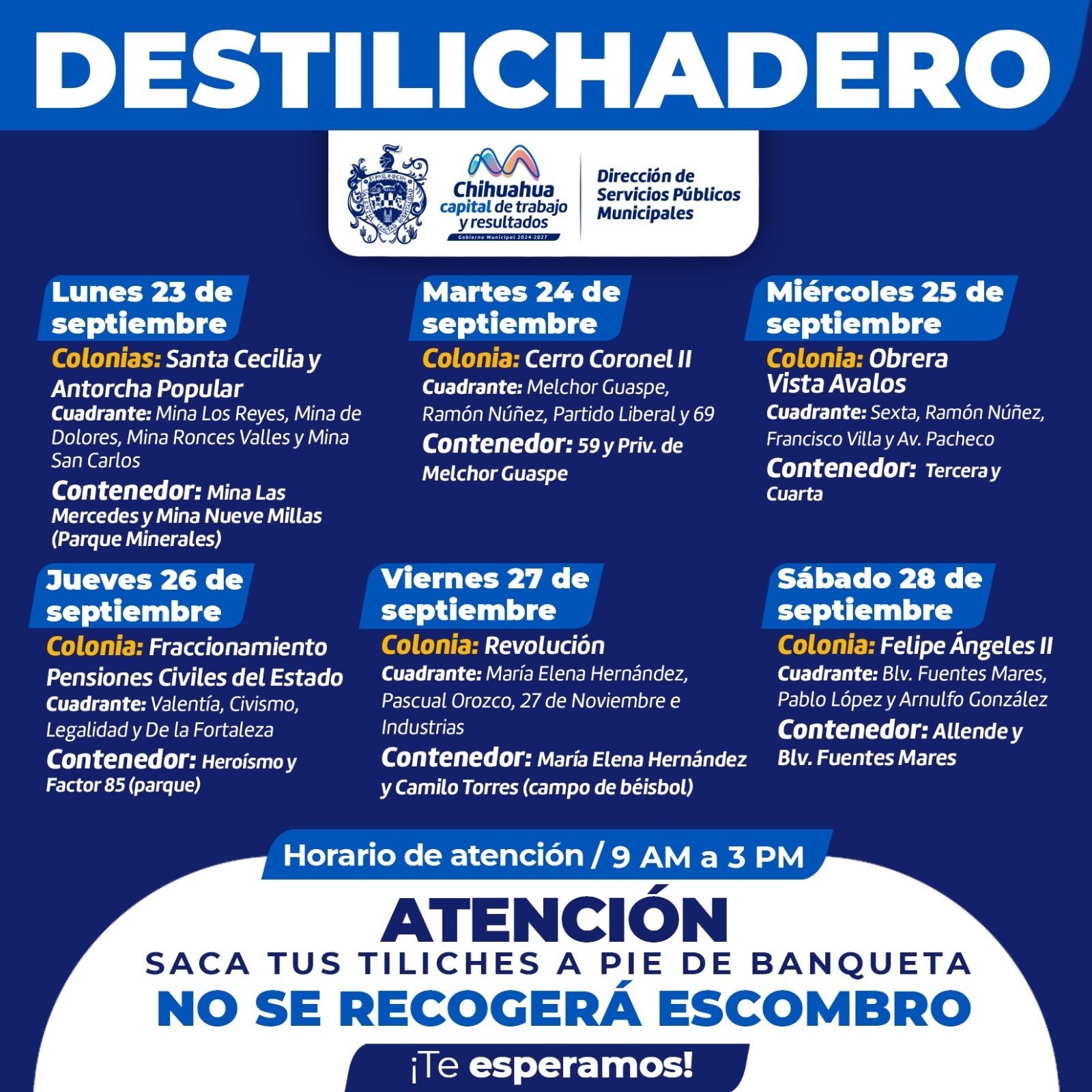 Chihuahua, Chih.- La Dirección de Servicios Públicos Municipales, informa el calendario del programa Destilichadero, que se realizará del 23 al 28 de septiembre en siete colonias de la Capital con el objetivo de evitar acumulaciones de basura de grandes dimensiones en las viviendas, que podría generar plagas o problemas de salud.