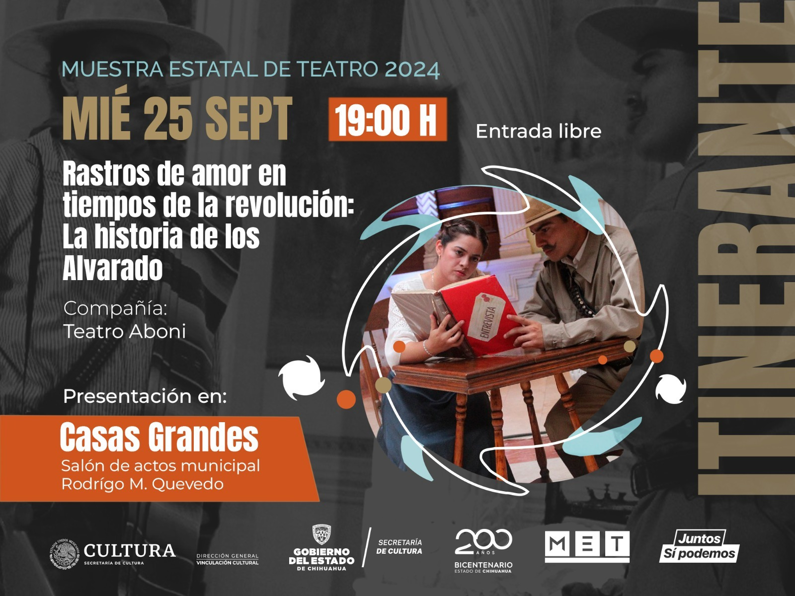 En Casas Grandes la CompañĂa de teatro “Aboni”, originaria de Parral, presentará la obra “Rastros de amor en tiempos de la revoluciĂłn: la historia de los Alvarado”, en el SalĂłn de Actos Municipal “Rodrigo M. Quevedo”, el miĂ©rcoles 25 de septiembre a las 19:00 horas.