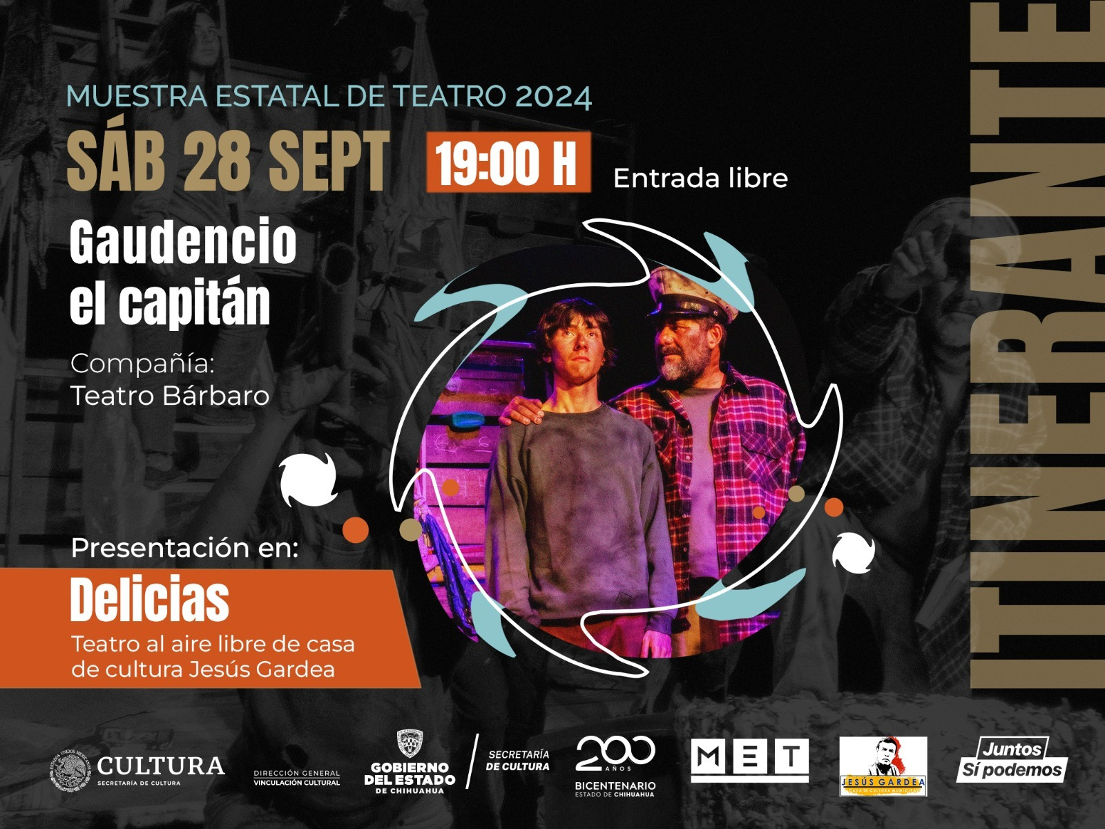 En Delicias, “Teatro Bárbaro” compañĂa originaria de la capital, presentará “Gaudencio el capitán”, que se presentará en el teatro al aire libre “JesĂşs Gardea” de la Casa de la Cultura, en punto de las 19:00 horas.
