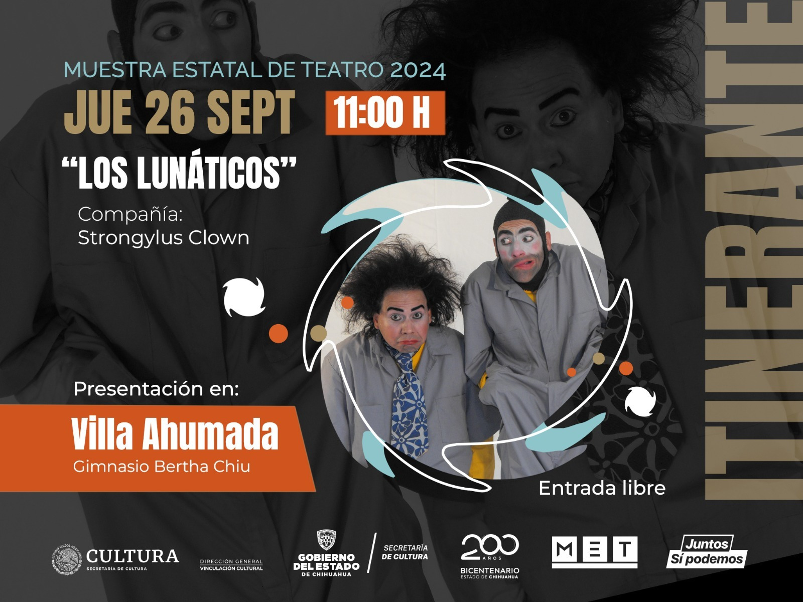 Para Ahumada se tendrá la presentaciĂłn de la compañĂa “Strongylus clown” de la ciudad de Chihuahua, con la puesta en escena “Los lunáticos”, en el gimnasio Bertha Chiu el jueves 26 de septiembre a las 11:00 horas.