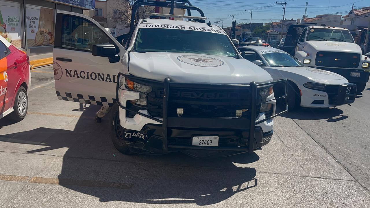 Chihuahua, Chih.- Una patrulla de la Guardia Nacional chocó contra un vehículo particular en la avenida Paseos del Real, en la colonia Villas del Real. Afortunadamente, el incidente