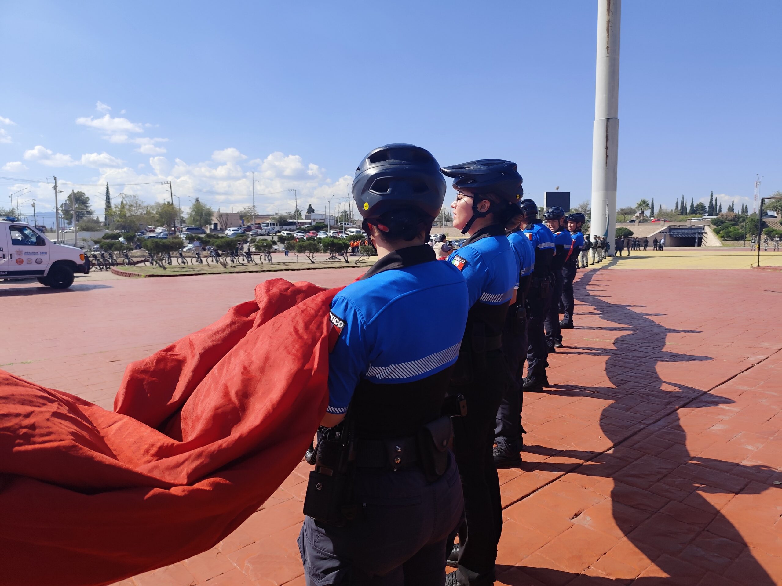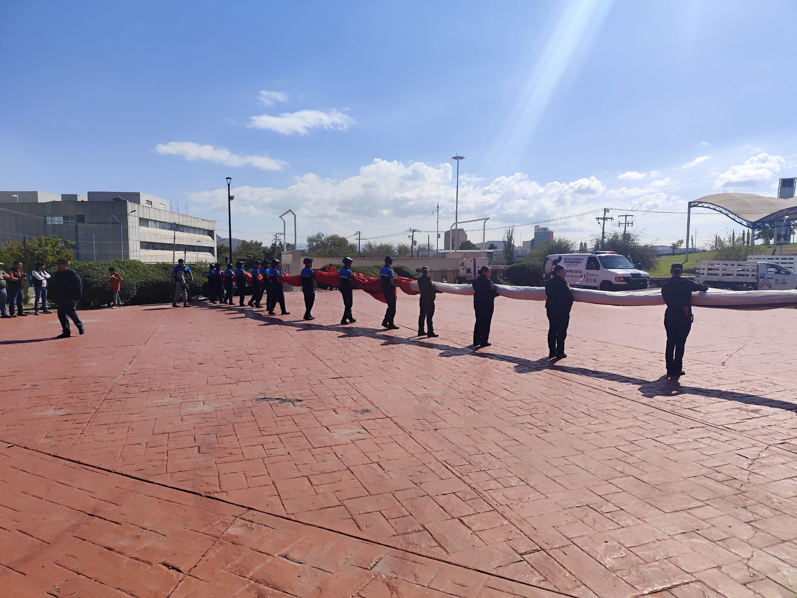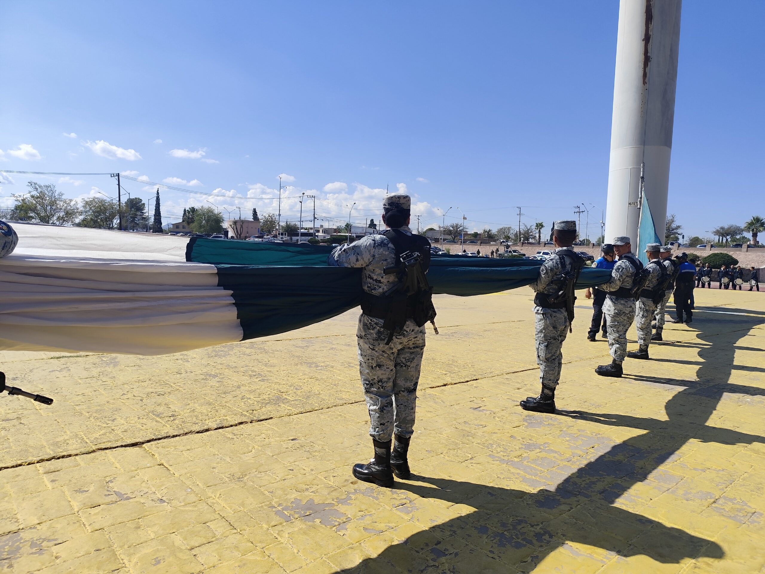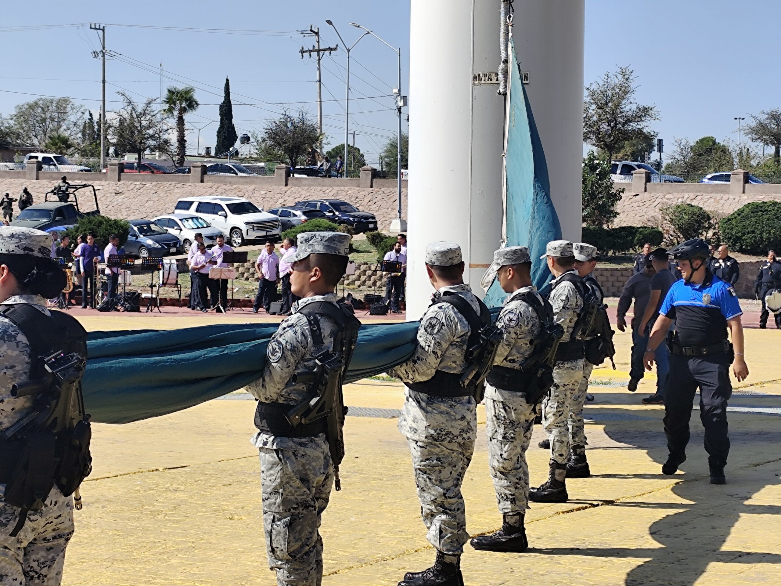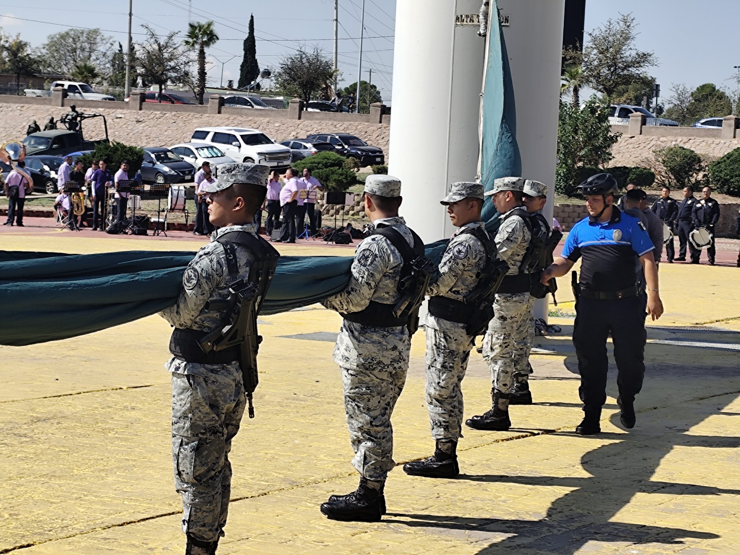 Chihuahua, Chih.- Con motivo del Día del Docente, se llevó a cabo una ceremonia de izamiento de bandera en el parque El Palomar, encabezada por el alcalde Marco Bonilla.