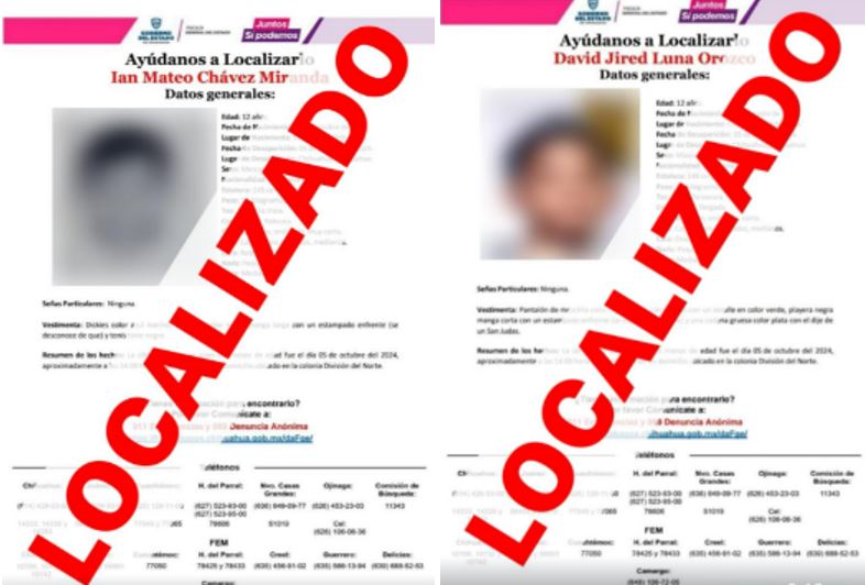 Chihuahua, Chih.- Las autoridades informaron que los dos menores de edad, Ian Mateo Chávez Miranda y David Jared Luna Orozco, quienes habían sido reportados como desaparecidos el pasado