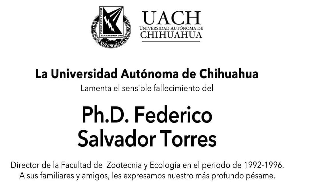 Chihuahua, Chih.- El personal Académico Jubilado y Pensionado de la Universidad Autónoma de Chihuahua (UACH) informó el lamentable fallecimiento del maestro Federico Salvador Torres, quien fuera director de
