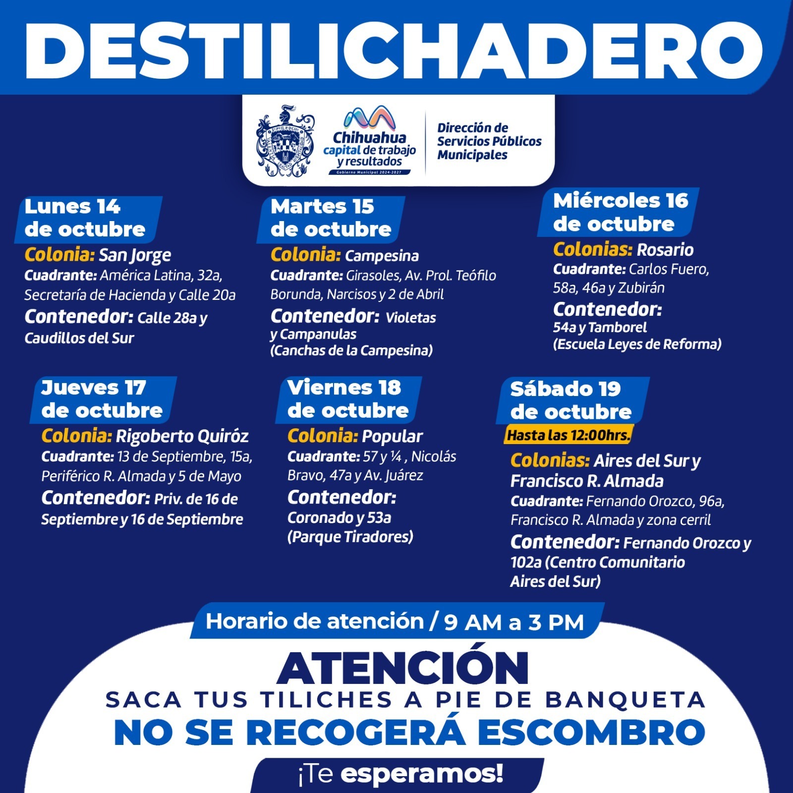 Chihuahua, Chih.- La Dirección de Servicios Públicos Municipales, informa el calendario del programa Destilichadero, que se realizará del 14 al 19 de octubre en siete colonias de la capital para evitar acumulaciones de basura de grandes dimensiones en las viviendas, que podría generar plagas o problemas de salud.