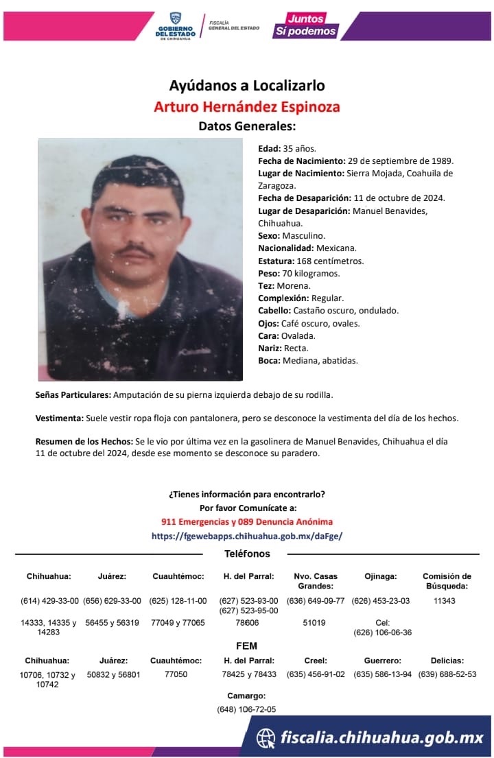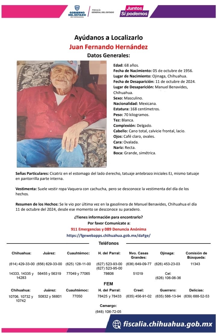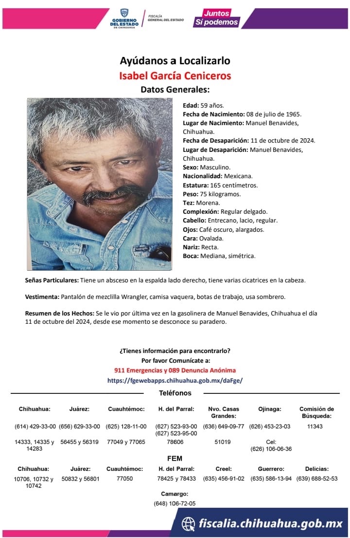 Las personas buscadas responden a los nombres de Isabel García Ceniceros, Arturo Hernández Espinoza y Juan Fernando Hernández, de 59, 35 y 68 años de edad respectivamente, quienes, de acuerdo con los reportes de ausencia interpuestos ante el Ministerio Público, fueron vistos por última vez el 11 de octubre de 2024, en la gasolinera ubicada en el citado poblado.