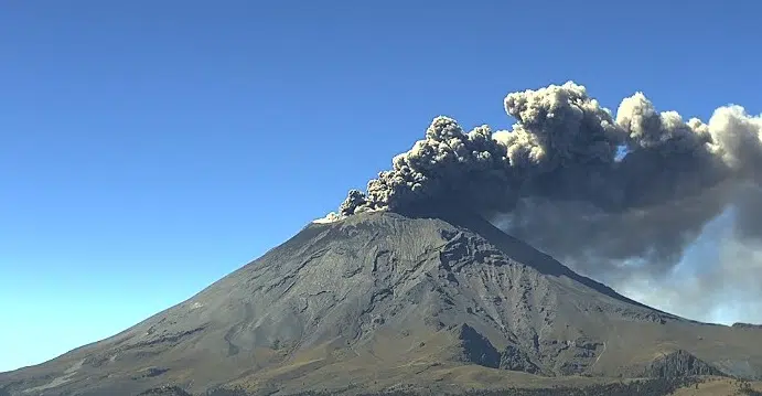 Chihuahua, Chih.- El volcán Popocatépetl ha registrado actividad significativa, emitiendo material incandescente que se observa en sus laderas, además de una columna de vapor, gas y cenizas que
