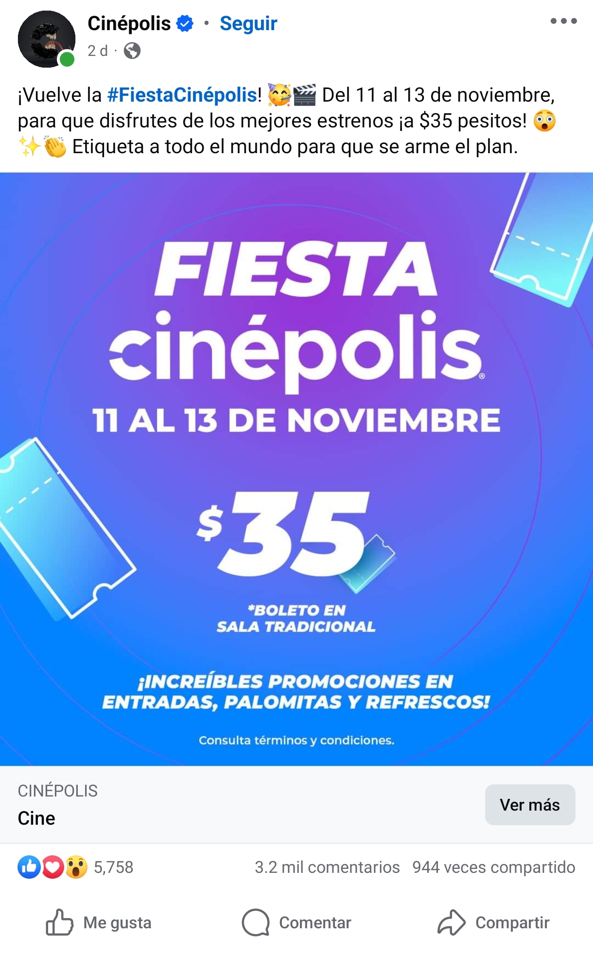 Durante estos días, los boletos para salas tradicionales, Cinépolis Pluus, Macro XE y Junior costarán solo $35, mientras que en salas VIP, IMAX, 4DX y ScreenX tendrán un precio de $80.