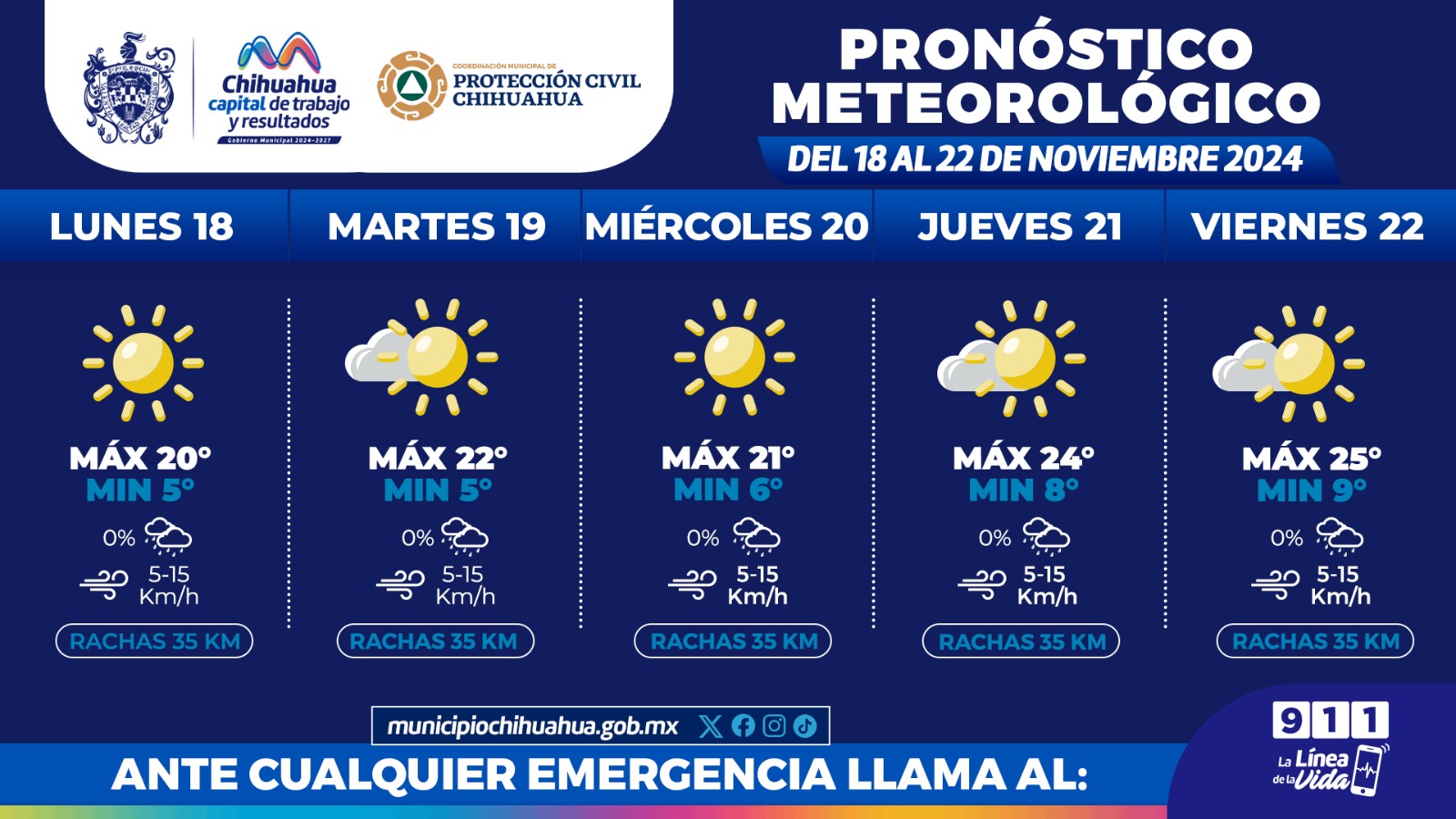 Chihuahua, Chih.- La Coordinación Municipal de Protección Civil informó que para esta semana, del 18 al 22 de noviembre, se esperan temperaturas máximas de 25°C y mínimas de 5°C. Según el pronóstico del Servicio Meteorológico Nacional de CONAGUA, este lunes se alcanzarán los 20°C, mientras que el martes se prevé una mínima de 5°C.