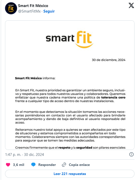 A través de un comunicado, Smart Fit manifestó su postura frente al caso.