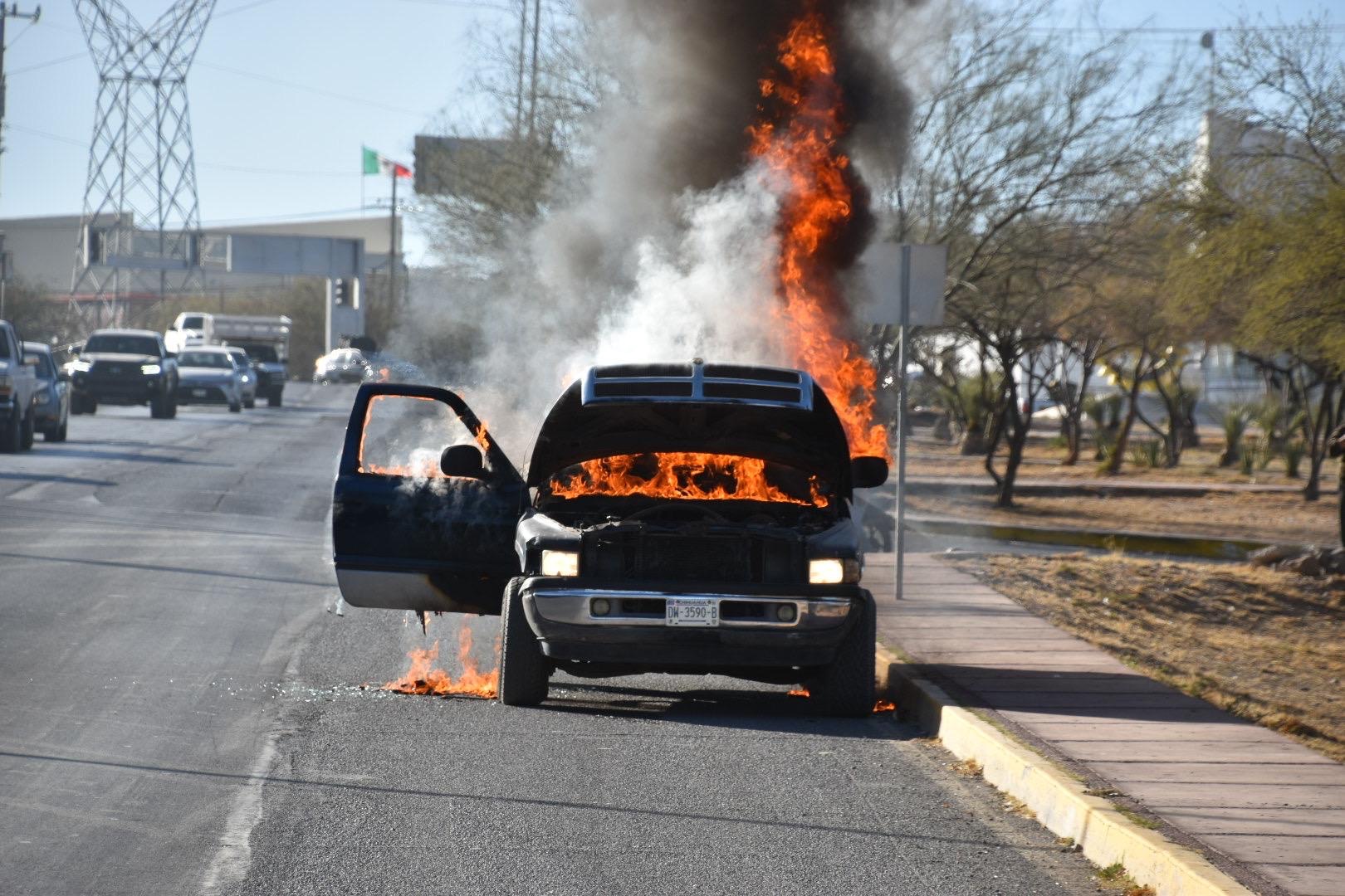 Chihuahua, Chih.- Una intensa movilización de cuerpos de seguridad y emergencia se registró esta tarde al norte de la ciudad, luego de que una pickup RAM, modelo atrasado, se incendiara en plena circulación sobre la avenida Nogales, entre las avenidas de las Industrias y Tecnológico.