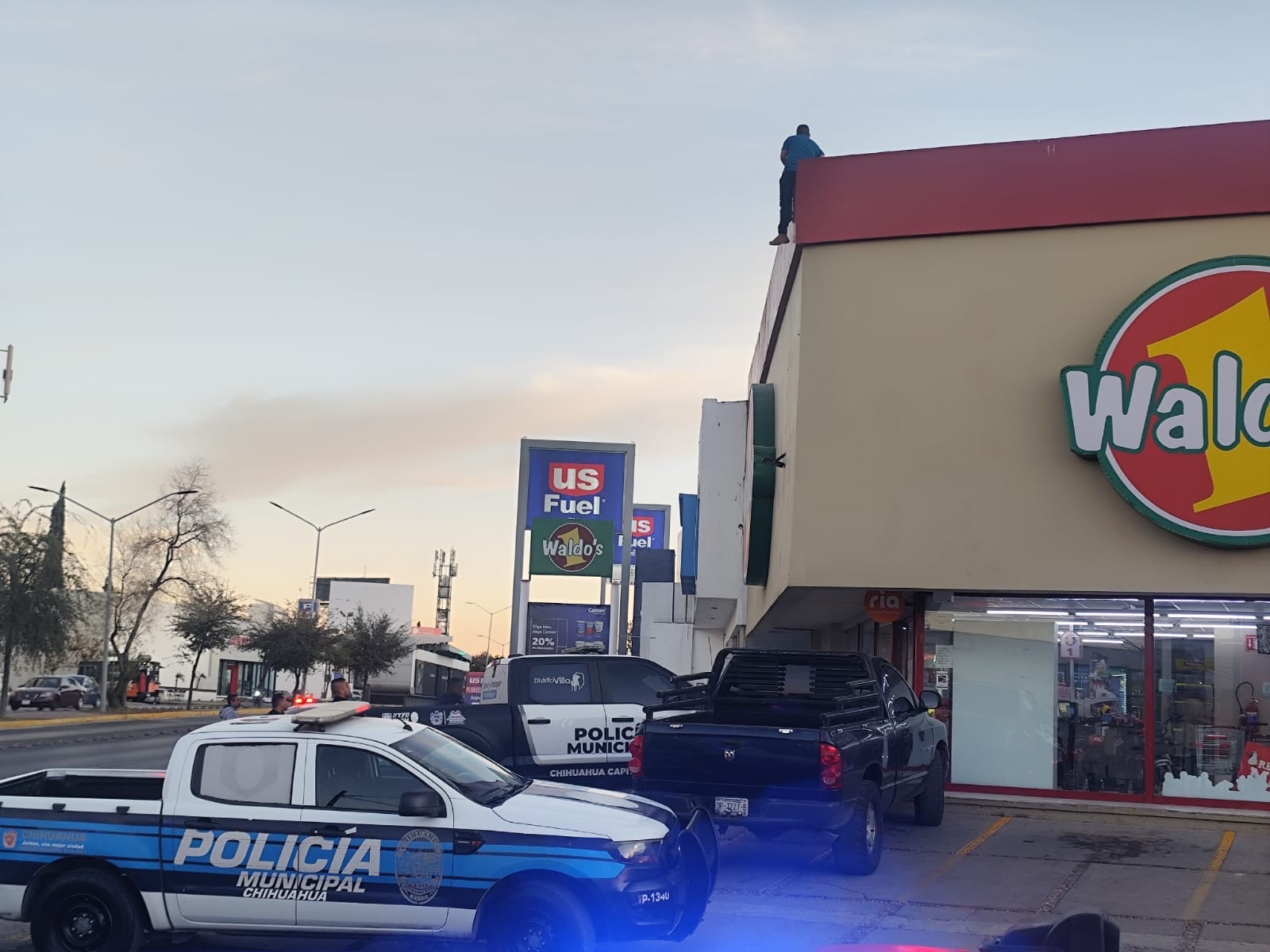 Chihuahua, Chih.- Una intensa movilización policiaca y de bomberos se desató esta tarde en el centro de la ciudad, luego de que un hombre de entre 35 y 40 años subiera a la orilla de la sucursal de Waldos, ubicada en la avenida Universidad y calle Leyes, con la intención de quitarse la vida.