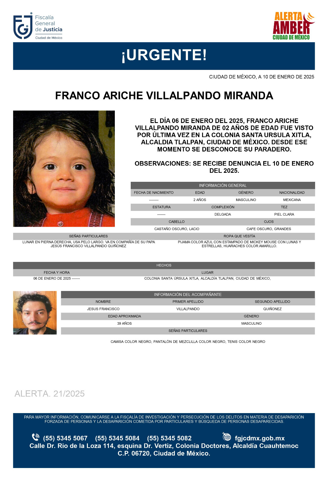 Las autoridades de la Ciudad de México han activado una Alerta Amber para localizar al pequeño Franco Ariche Villalpando Miranda, de dos años de edad, quien fue visto