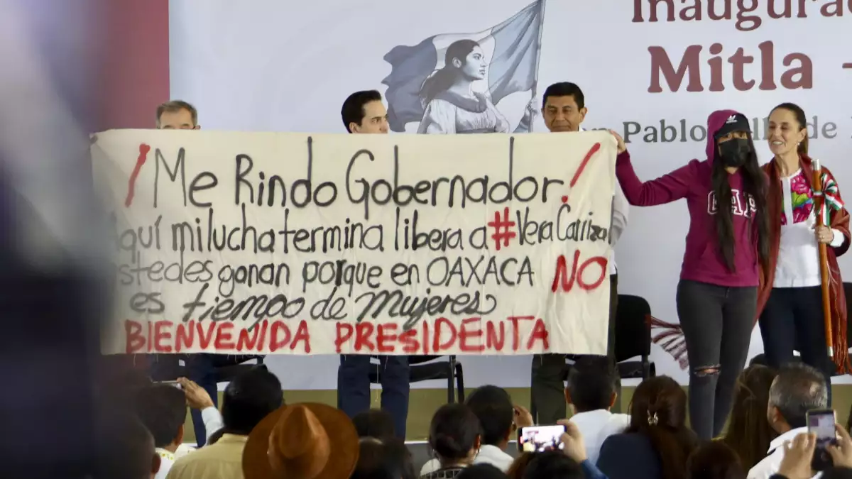 La saxofonista María Elena Ríos burló la seguridad en un evento de la presidenta Claudia Sheinbaum para protestar contra el gobernador Salomón Jara por la presunta liberación de su agresor