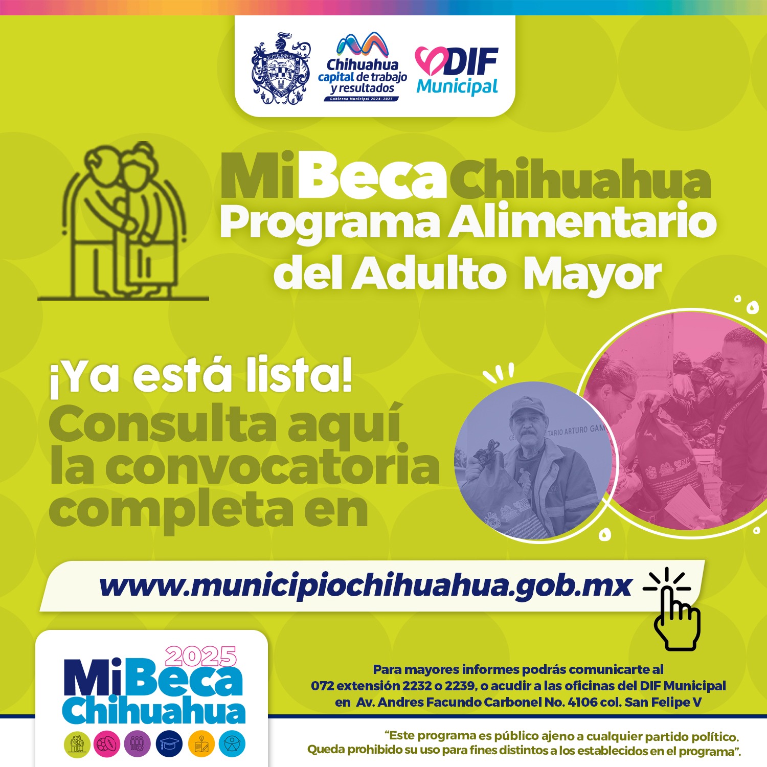 Chihuahua, Chihuahua – El Gobierno Municipal, a través del DIF, convoca a las y los adultos mayores de 60 años y en situación de vulnerabilidad económica, al Programa